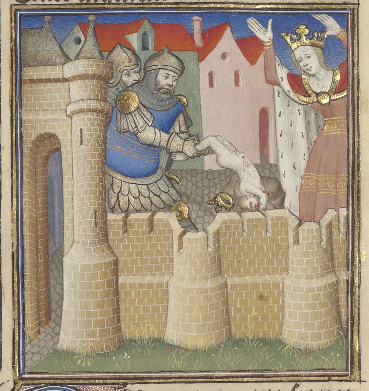 Parigi, Bibliothèque de l'Arsenal, 5193, f. 37r. Neottolemo (Pirro) uccide il piccolo Astianatte gettandolo dalle mura di Troia, sotto gli occhi della regina Ecuba.