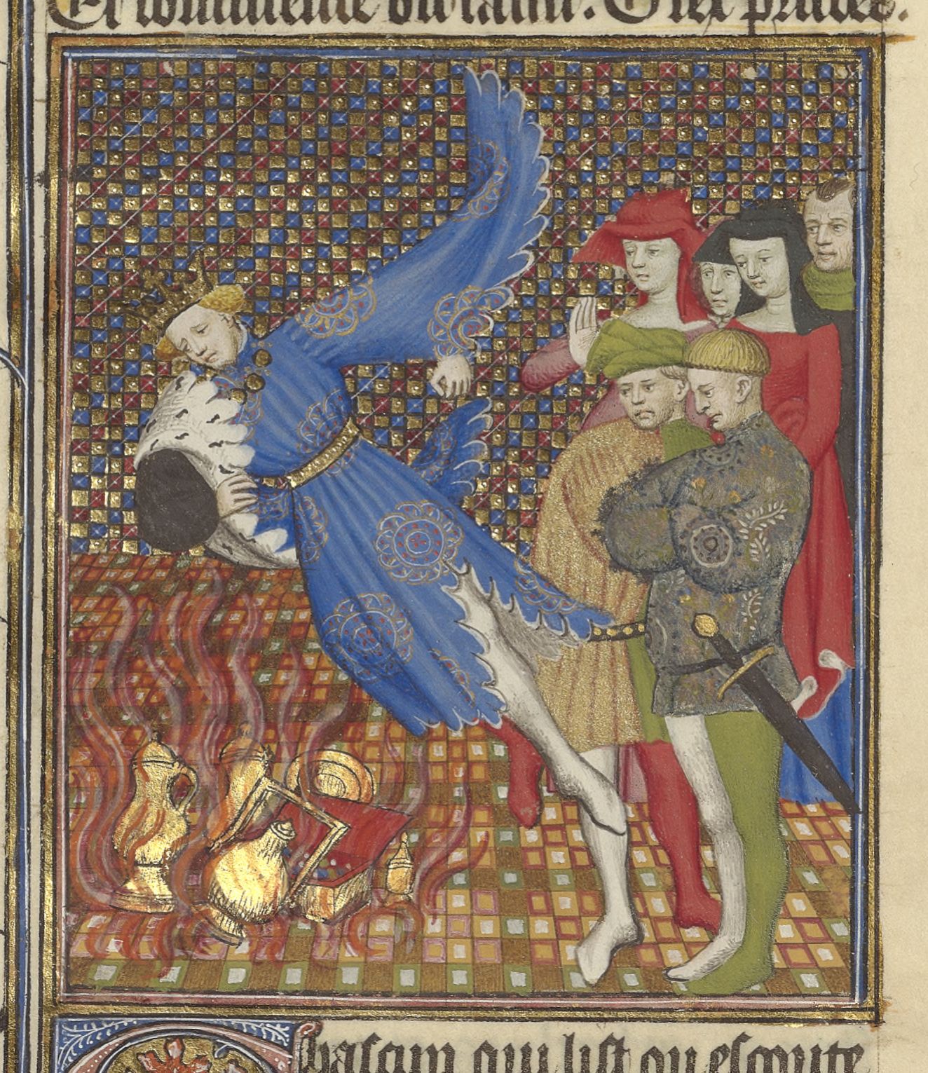 Parigi, Bibliothèque de l'Arsenal, 5193, f. 66v. Sardanapalo si getta nel rogo con i suoi tesori.