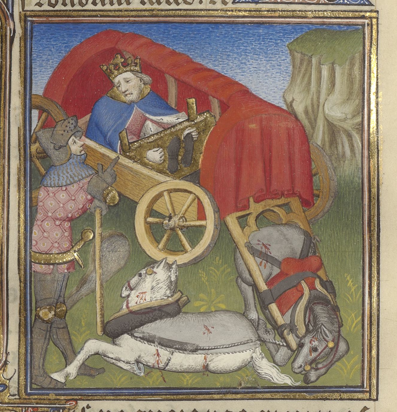 Parigi, Bibliothèque de l'Arsenal, 5193, f. 151r. Dario re di Persia, posto in ceppi su un carro, detta ad un soldato le sue ultime volontà.