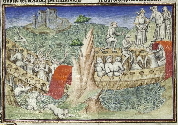 Città del Vaticano, Biblioteca Apostolica Vaticana, Pal. lat. 1989, f. 57r. Il copista del manoscritto, datato 15 giugno 1414, è Laurent de Premierfait. La nave di Alatiel fa naufragio; alla fine del viaggio Alatiel ritorna in nave dal re suo padre e dal suo promesso sposo.