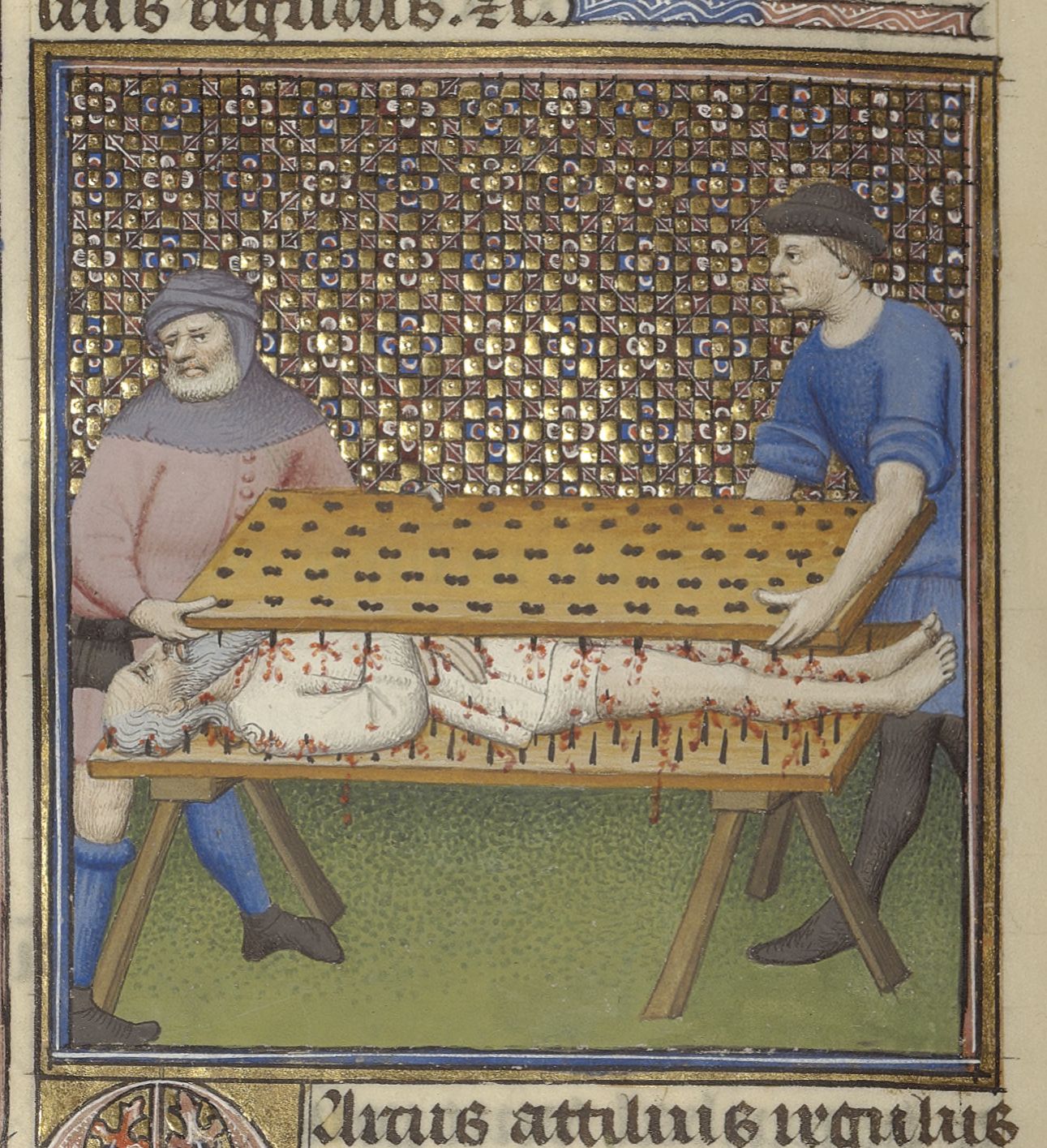 Parigi, Bibliothèque de l'Arsenal, 5193, f. 188v. Attilio Regolo viene torturato tra due assi chiodate.
