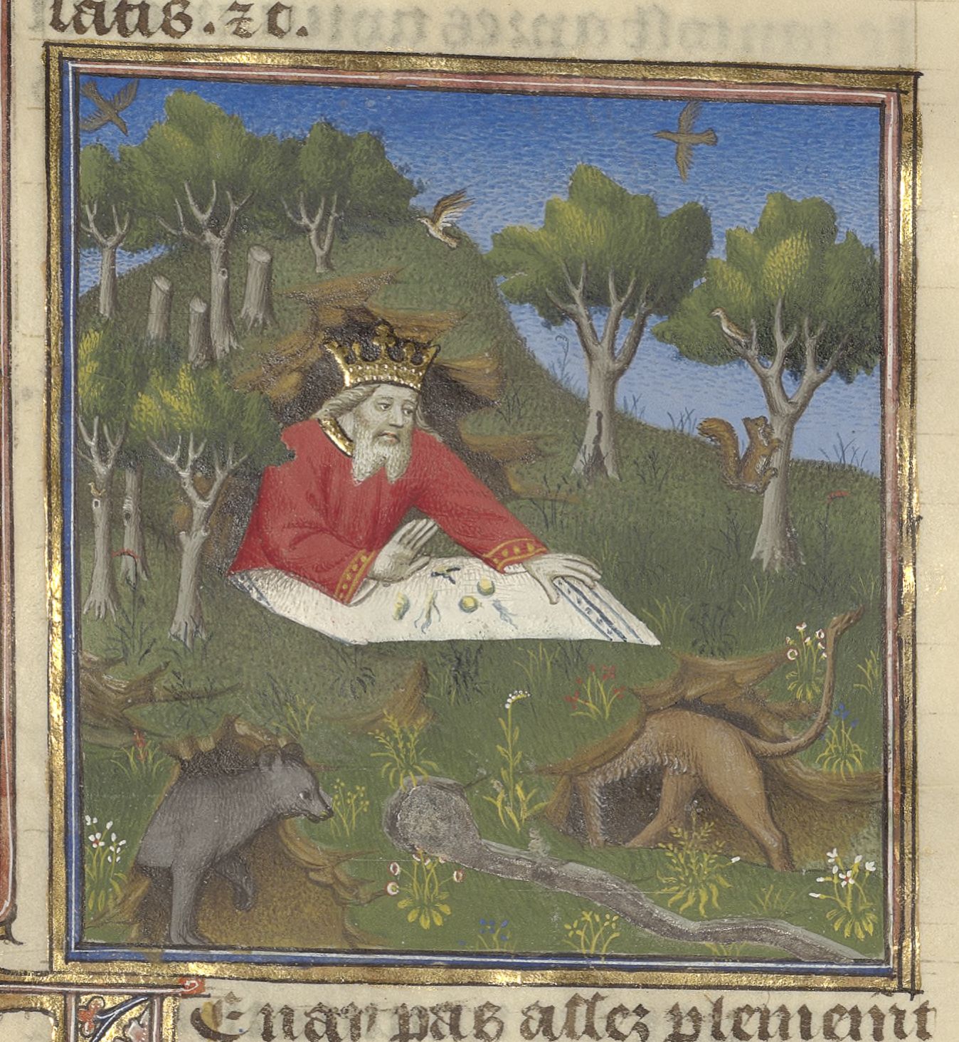 Parigi, Bibliothèque de l'Arsenal, 5193, f. 196v. Massinissa vive nascosto in una caverna nella foresta.
