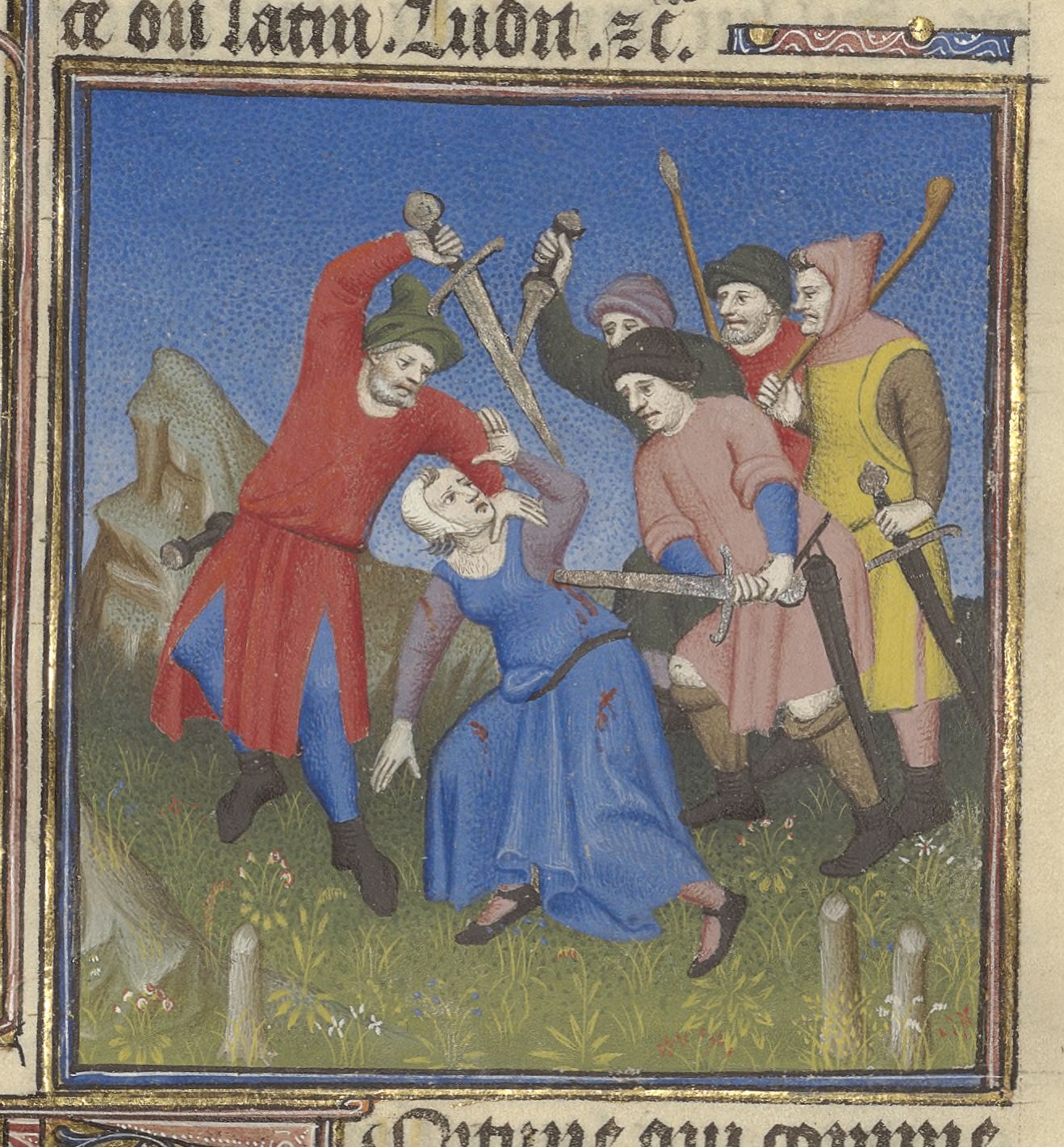 Parigi, Bibliothèque de l'Arsenal, 5193, f. 214v. Ammonio, prefetto di Alessandro Magno, tenta di fuggire travestito da donna ma viene riconosciuto e assassinato.
