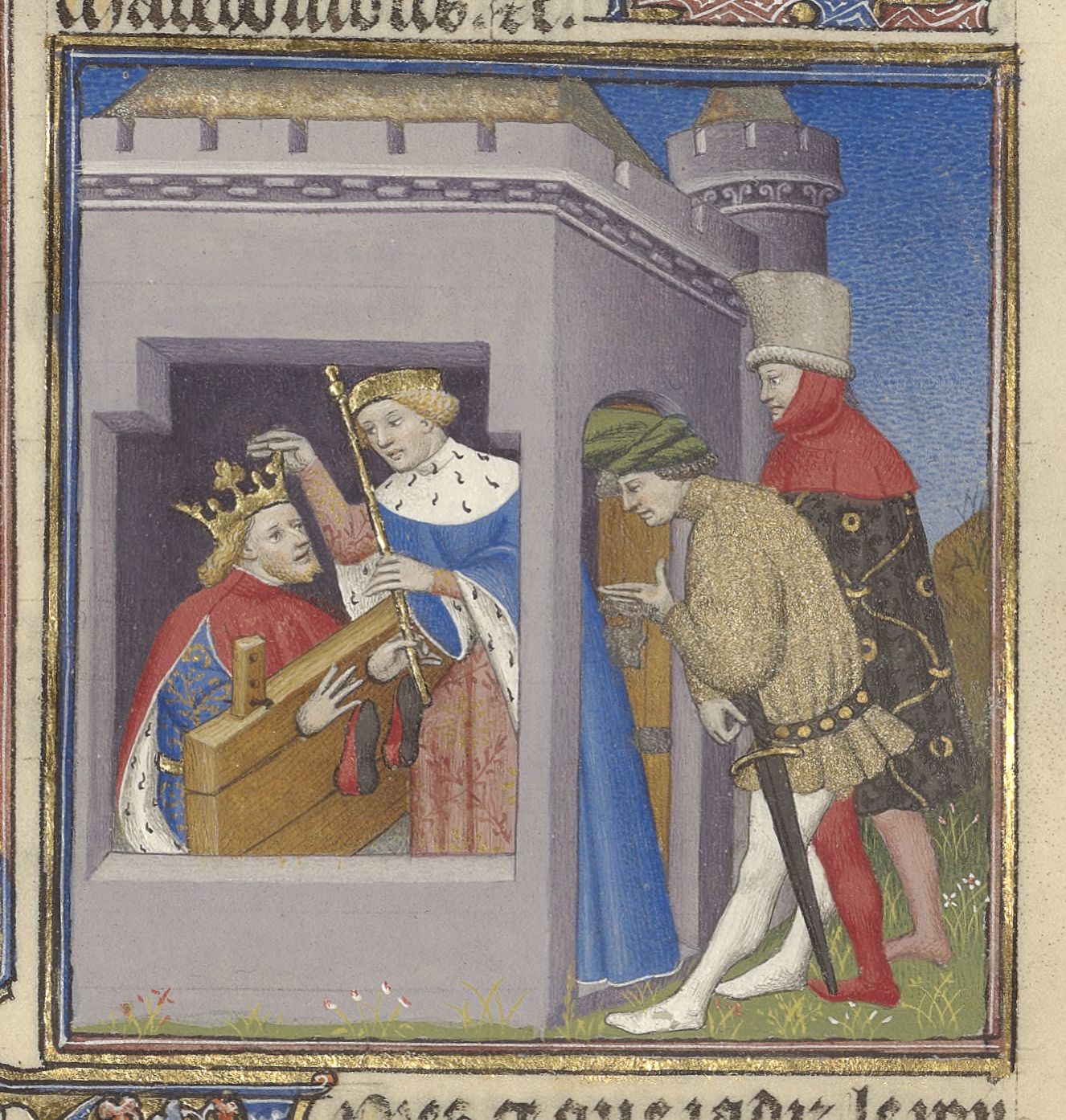 Parigi, Bibliothèque de l'Arsenal, 5193, f. 215v. Andrisco, che si faceva passare per Filippo, viene smascherato e posto in ceppi in prigione.