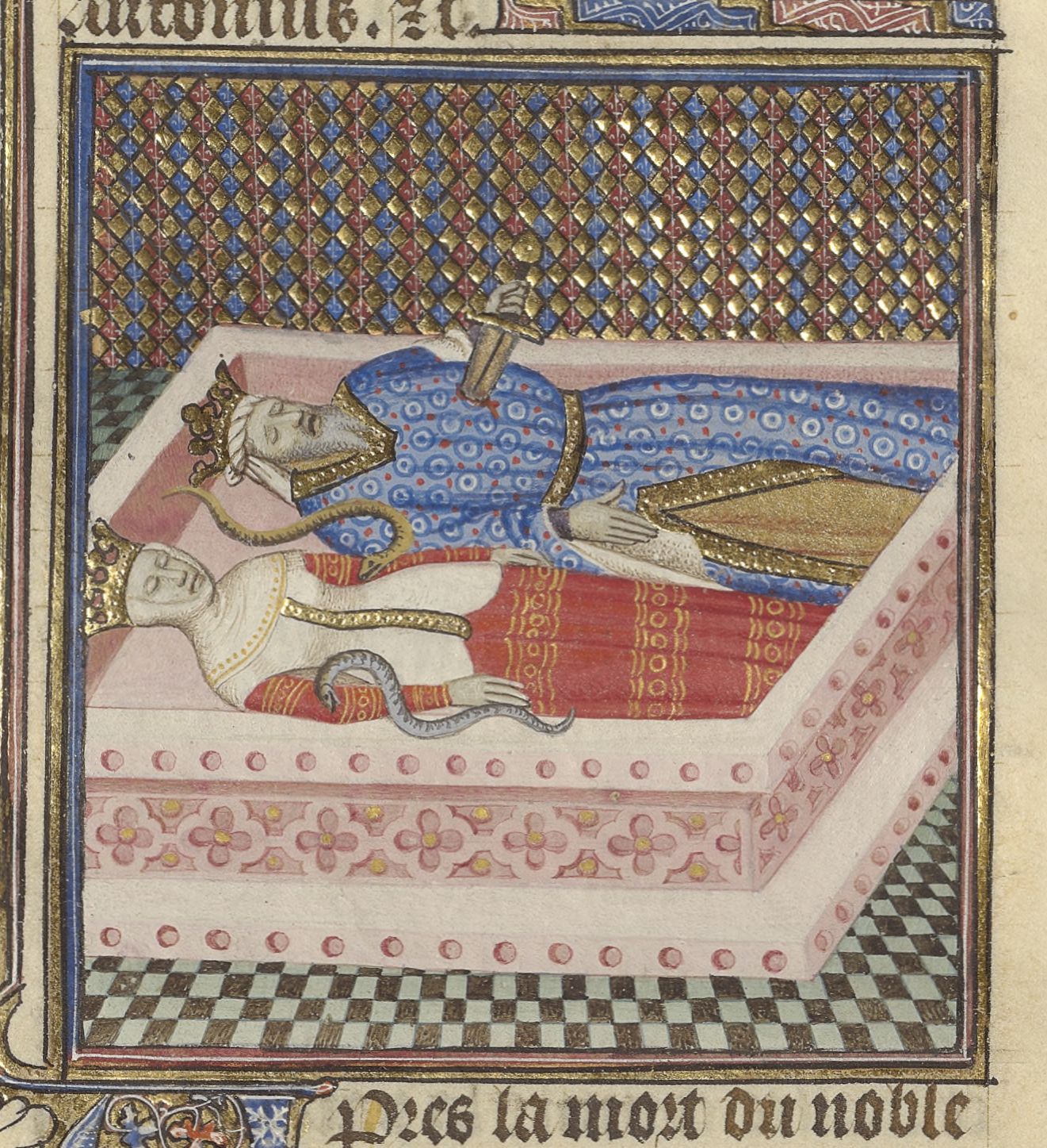 Parigi, Bibliothèque de l'Arsenal, 5193, f. 272v. Il corpo di Antonio, trafitto da un pugnale, giace accanto a quello di Cleopatra, avvelenata da due aspidi.