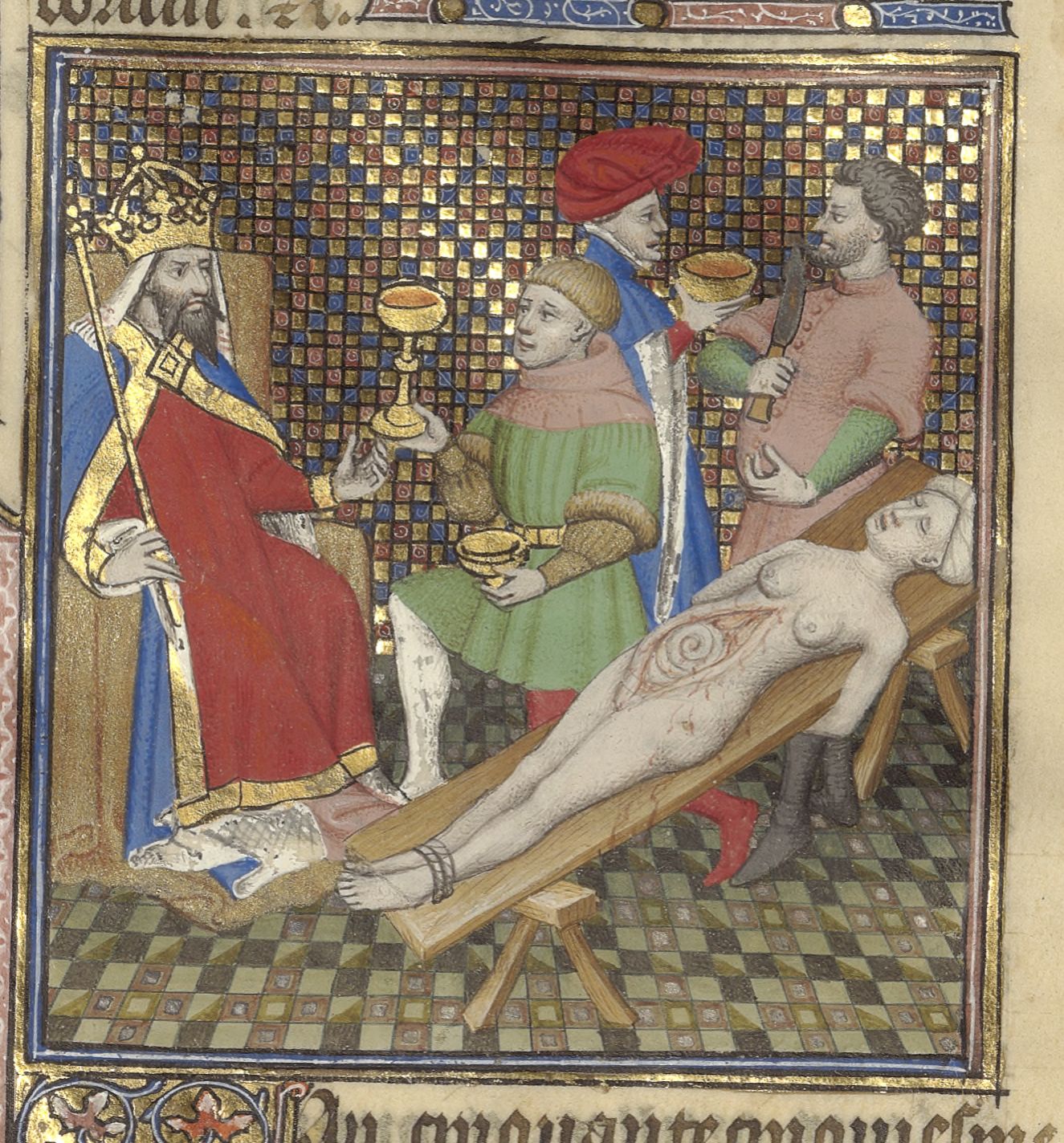 Parigi, Bibliothèque de l'Arsenal, 5193, f. 290v. Nerone fa squartare la madre Agrippina e ne beve il sangue da una coppa.