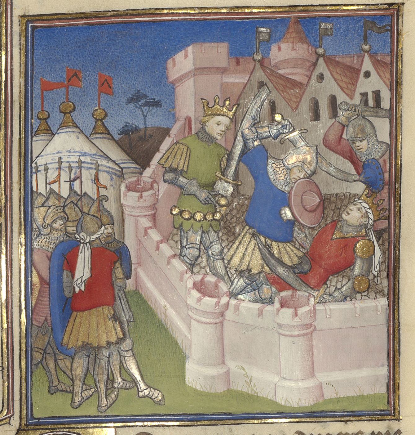Parigi, Bibliothèque de l'Arsenal, 5193, f. 345r. Teodorico assedia Ravenna con il suo esercito e fa uccidere Odoacre all'interno delle mura.