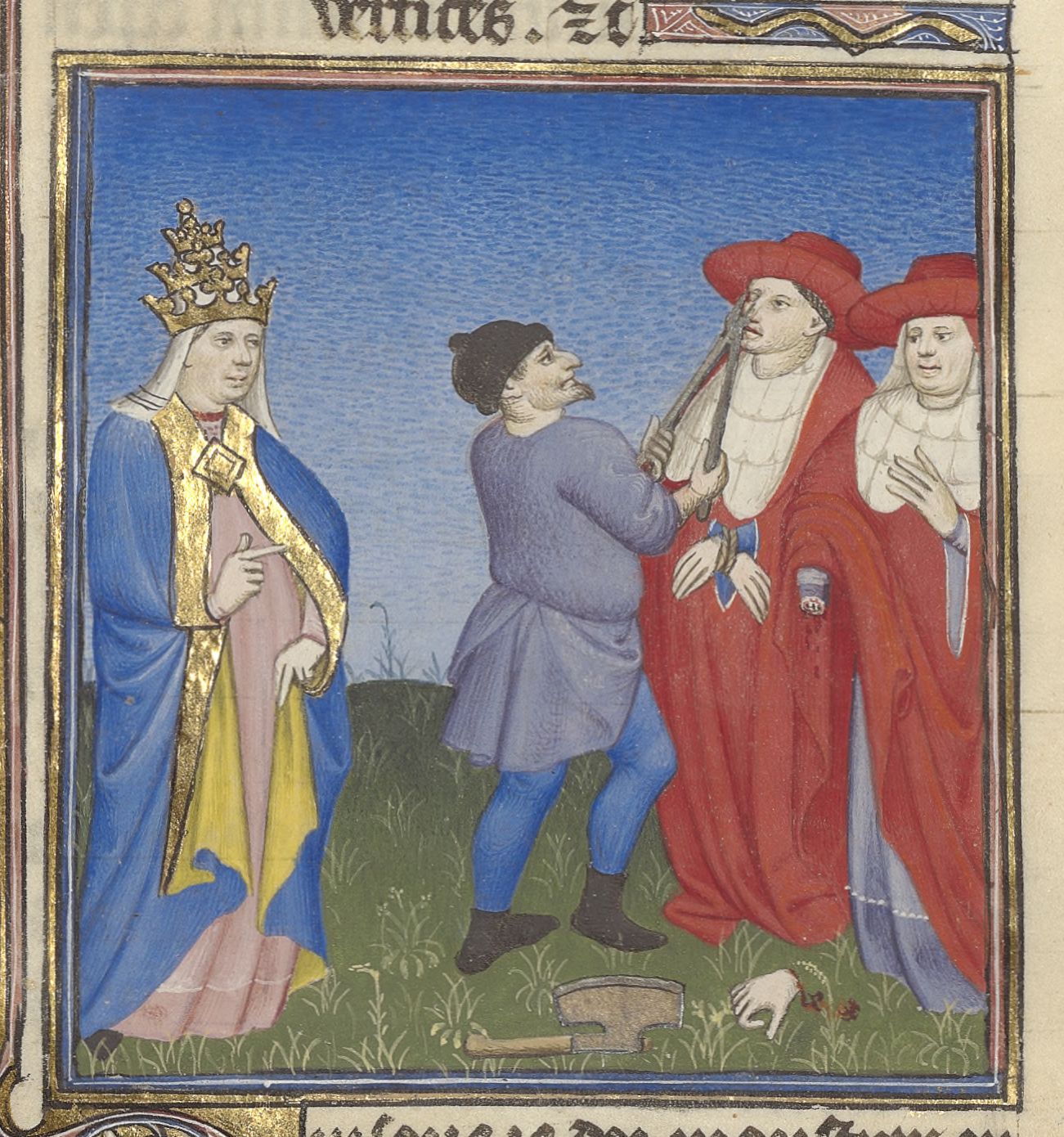 Parigi, Bibliothèque de l'Arsenal, 5193, f. 373r. Papa Giovanni XII fa tagliare il naso a un diacono e la mano ad un suddiacono.