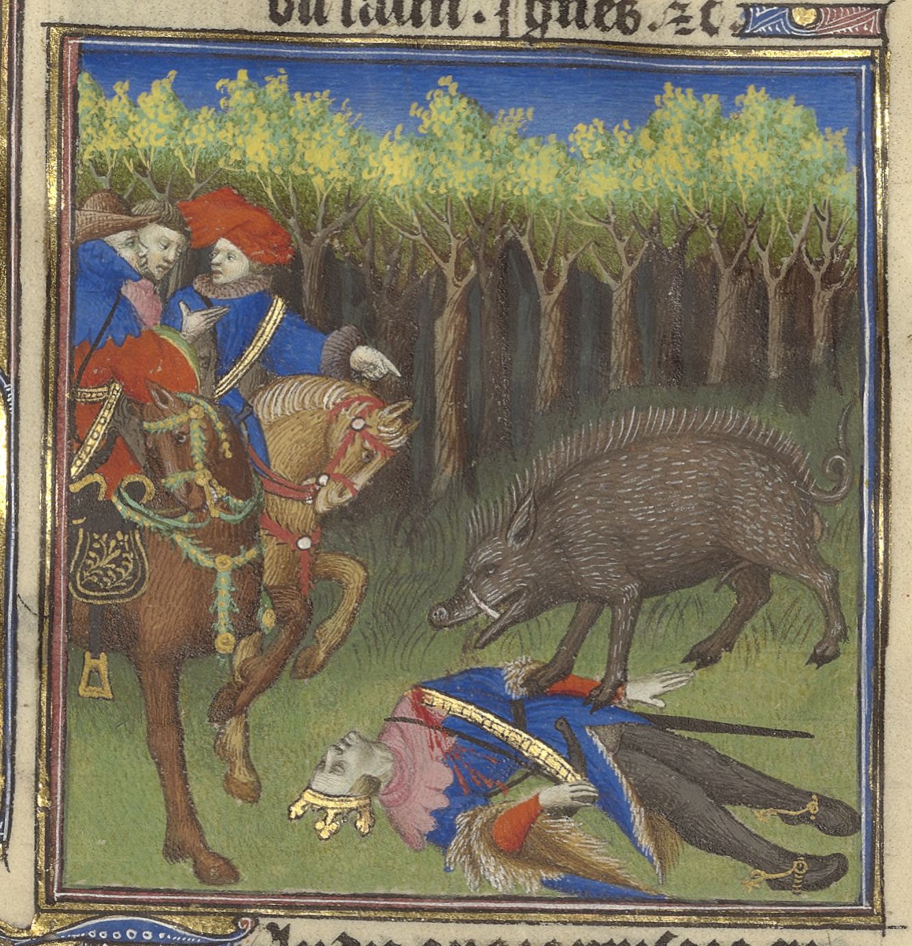 Parigi, Bibliothèque de l'Arsenal, 5193, f. 393v. Filippo il Bello viene sbranato da un cinghiale durante una battuta di caccia.