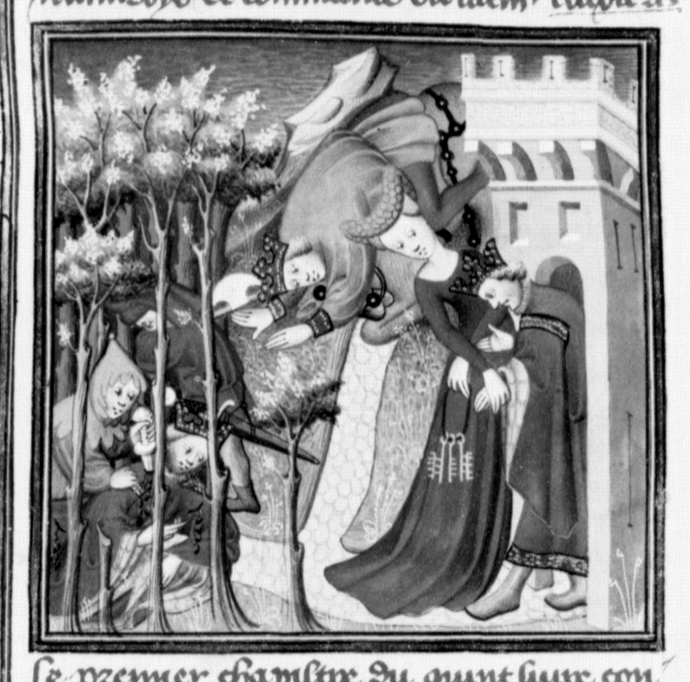Parigi, Bibliothèque Nationale de France, Fr. 131, f. 142r. Beronice consegna le chiavi della città a Seleuco in segno di resa; Antioco viene ucciso nel bosco dai banditi; Seleuco cade da cavallo.