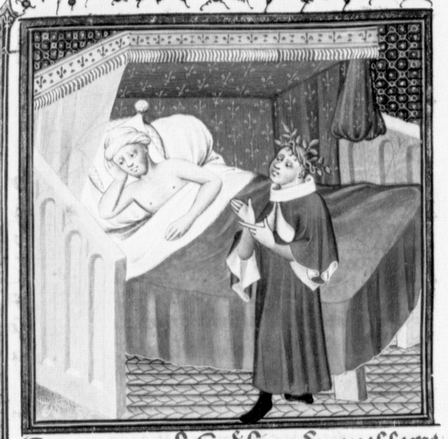 Parigi, Bibliothèque Nationale de France, Fr. 131, f. 241r. Francesco Petrarca, con una corona d'alloro sul capo, appare in sogno a Giovanni Boccaccio.