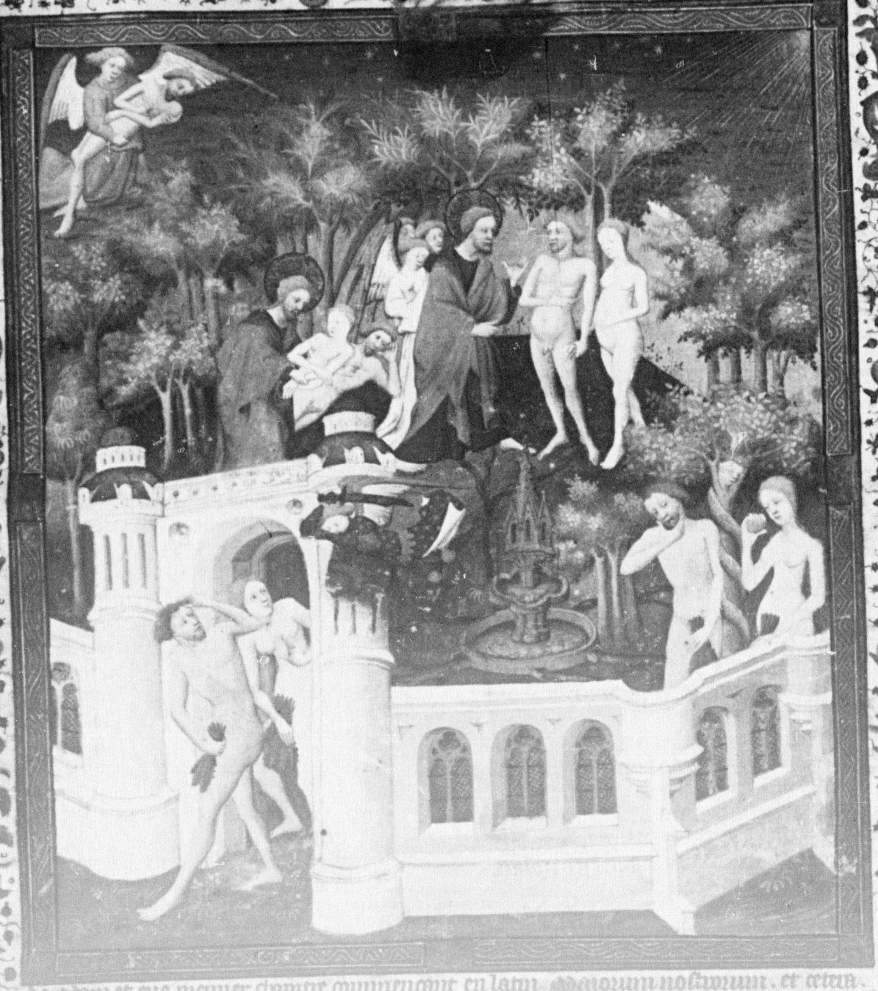 Parigi, Bibliothèque Nationale de France, Fr. 226, f. 6v. Sono raffigurate diverse scene tratte dalla Genesi all'interno del Giardino dell'Eden: un angelo trasporta il corpo di Adamo; Dio crea Eva dalla costola di Adamo; Dio, accompagnato da tre angeli, proibisce ad Adamo ed Eva di cogliere il frutto proibito; Adamo ed Eva vengono tentati dal serpente; un angelo con la spada sguainata caccia Adamo ed Eva dal Paradiso Terrestre. Nella cornice fitomorfa a margine si aprono cinque medaglioni, in cui sono raffigurati: la creazione di Adamo; Eva fila e Adamo zappa la terra; la scoperta dell'uccisione di Abele; l'uccisione di Abele; l'uccisione di Caino.