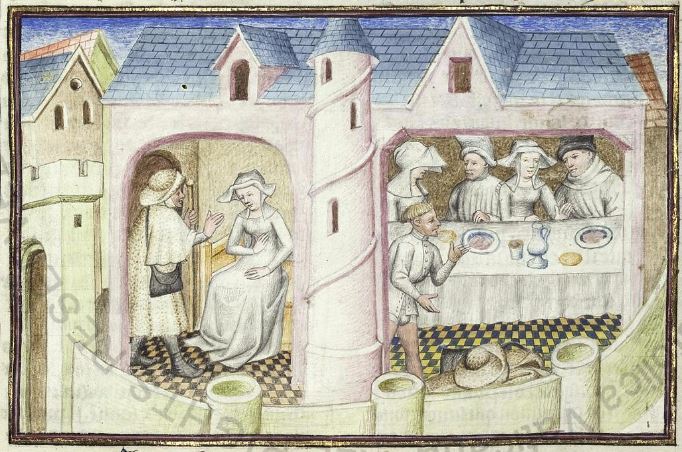Città del Vaticano, Biblioteca Apostolica Vaticana, Pal. lat. 1989, f. 100r. Il copista del manoscritto, datato 15 giugno 1414, è Laurent de Premierfait. Tedaldo, travestito da pellegrino, spinge monna Ermellina a confessarsi; durante un banchetto Tedaldo rivela la sua vera identità.