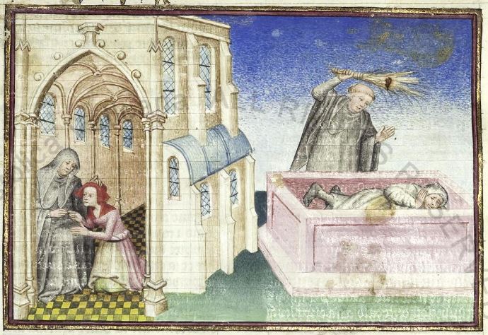 Città del Vaticano, Biblioteca Apostolica Vaticana, Pal. lat. 1989, f. 106v. Il copista del manoscritto, datato 15 giugno 1414, è Laurent de Premierfait. L'abate consegna alla moglie di Ferondo un anello durante la confessione; l'abate usa un randello per fustigare Ferondo, facendogli credere di essere in Purgatorio.