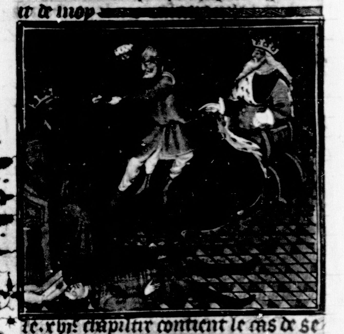 Parigi, Bibliothèque Nationale de France, Fr. 226, f. 50v. Salomone, dopo aver fatto uccidere i due figli di Sedecia, ordina che gli vengano strappati gli occhi con una tenaglia.