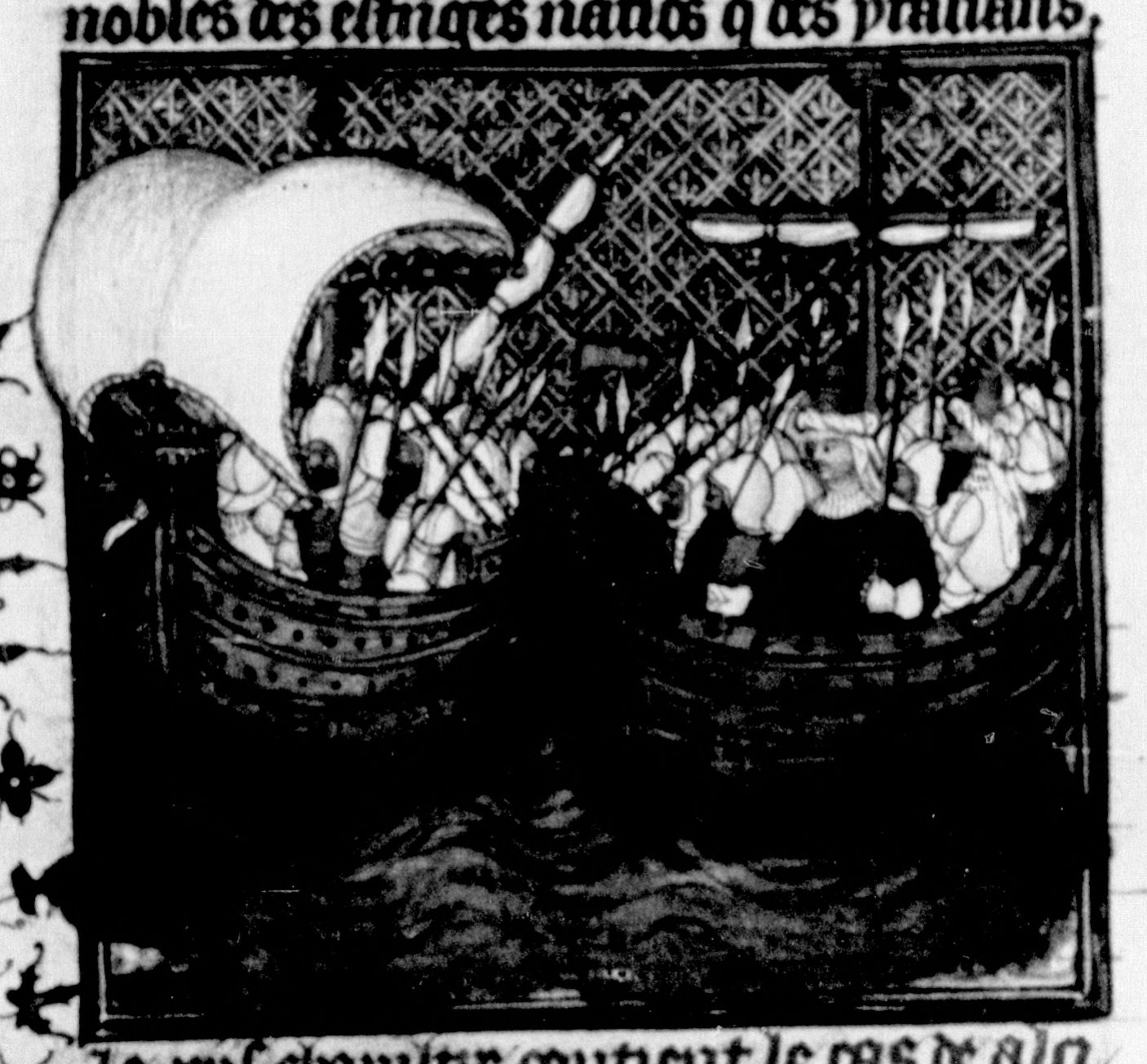 Parigi, Bibliothèque Nationale de France, Fr. 226, f. 84v. Alcibiade salpa con una flotta per attaccare la Sicilia.