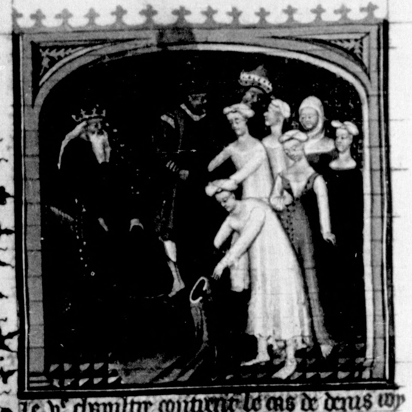 Parigi, Bibliothèque Nationale de France, Fr. 226, f. 98v. Dionisio II, tiranno di Siracusa, fa rapire le mogli dei cittadini di Locri e le costringe a svestirsi.