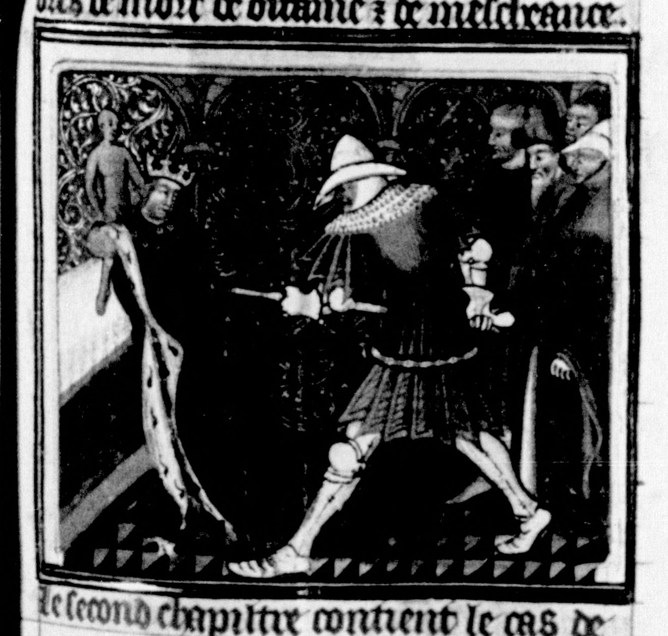 Parigi, Bibliothèque Nationale de France, Fr. 226, f. 127r. Deidamia, rifugiatasi nel tempio di Diana, viene raggiunta da Milone e uccisa.