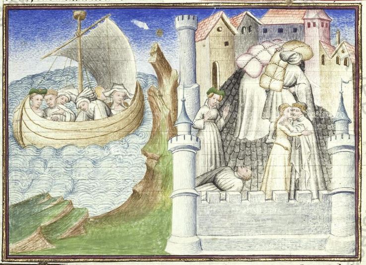 Città del Vaticano, Biblioteca Apostolica Vaticana, Pal. lat. 1989, f. 128v. Il copista del manoscritto, datato 15 giugno 1414, è Laurent de Premierfait. Tre sorelle con i loro mariti salpano verso Creta; all'interno della città sono raffigurati Ninetta sul corpo del marito avvelenato, Magdalena mentre bacia il duca di Creta, Bertella e Ughetto in fuga verso Rodi.