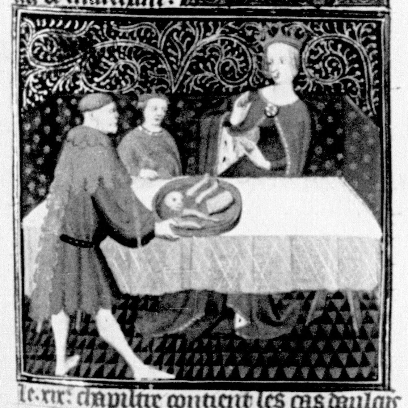 Parigi, Bibliothèque Nationale de France, Fr. 226, f. 151r. Tolomeo Evergete fa servire a Cleopatra il corpo smembrato del figlio durante il suo banchetto di compleanno.