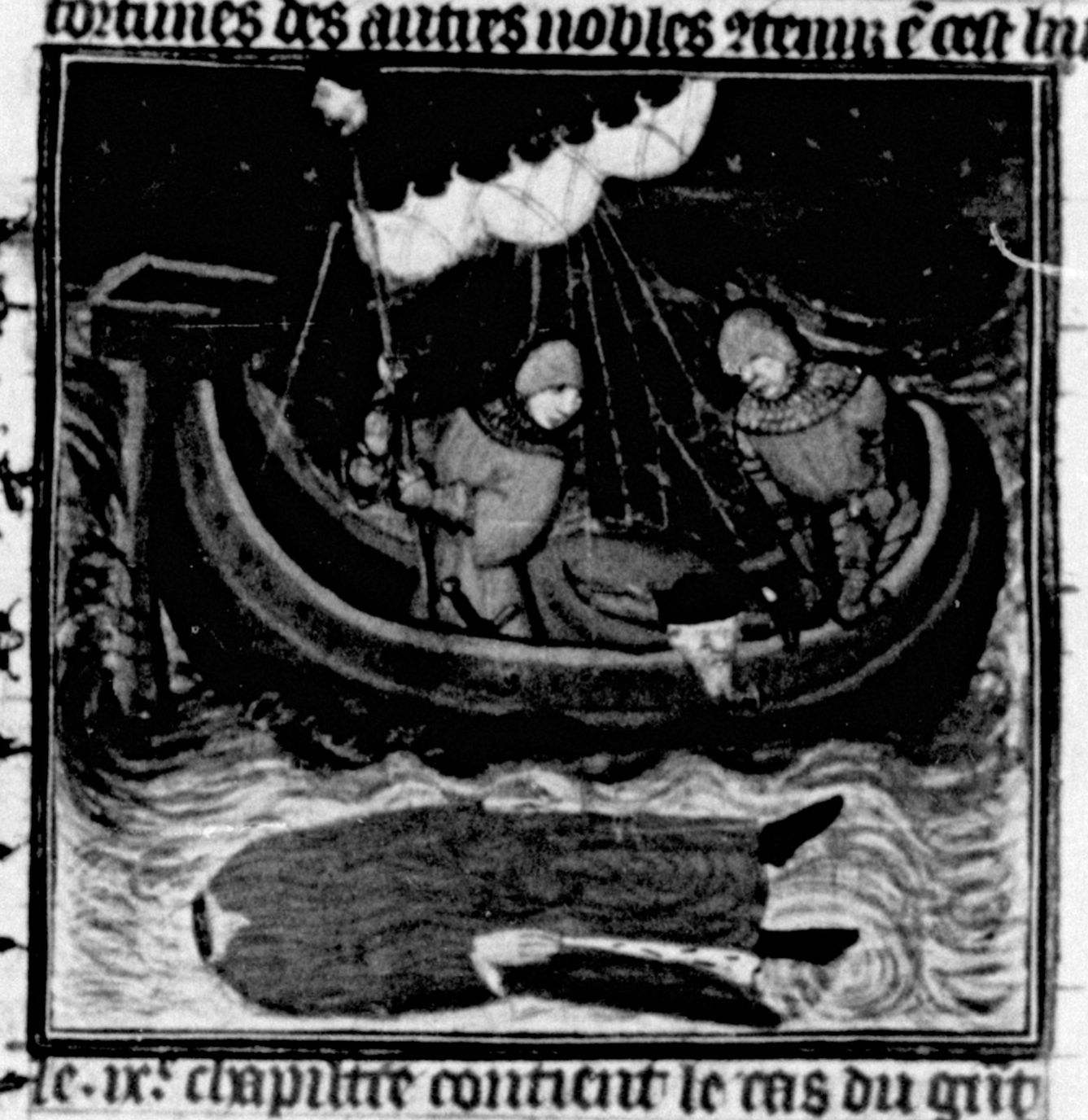 Parigi, Bibliothèque Nationale de France, Fr. 226, f. 169r. Due soldati di Tolomeo decapitano Pompeo e si imbarcano su una nave per recare la sua testa a Giulio Cesare.
