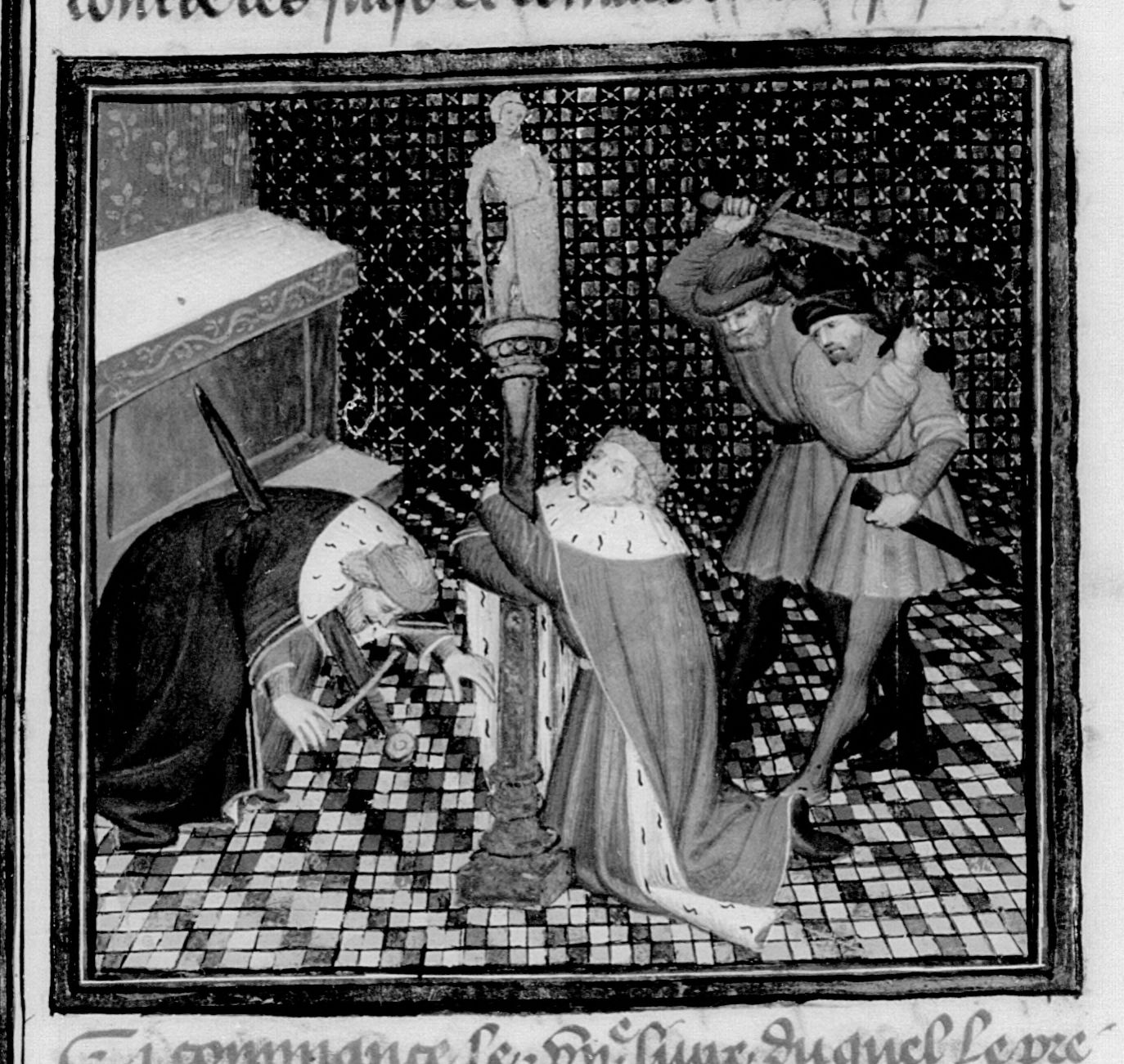 Parigi, Bibliothèque Nationale de France, Fr. 16994, f. 237r. Marco Antonio Minore viene assassinato mentre tenta di ripararsi dietro una statua di Giulio Cesare; un uomo si suicida gettandosi sulla spada.