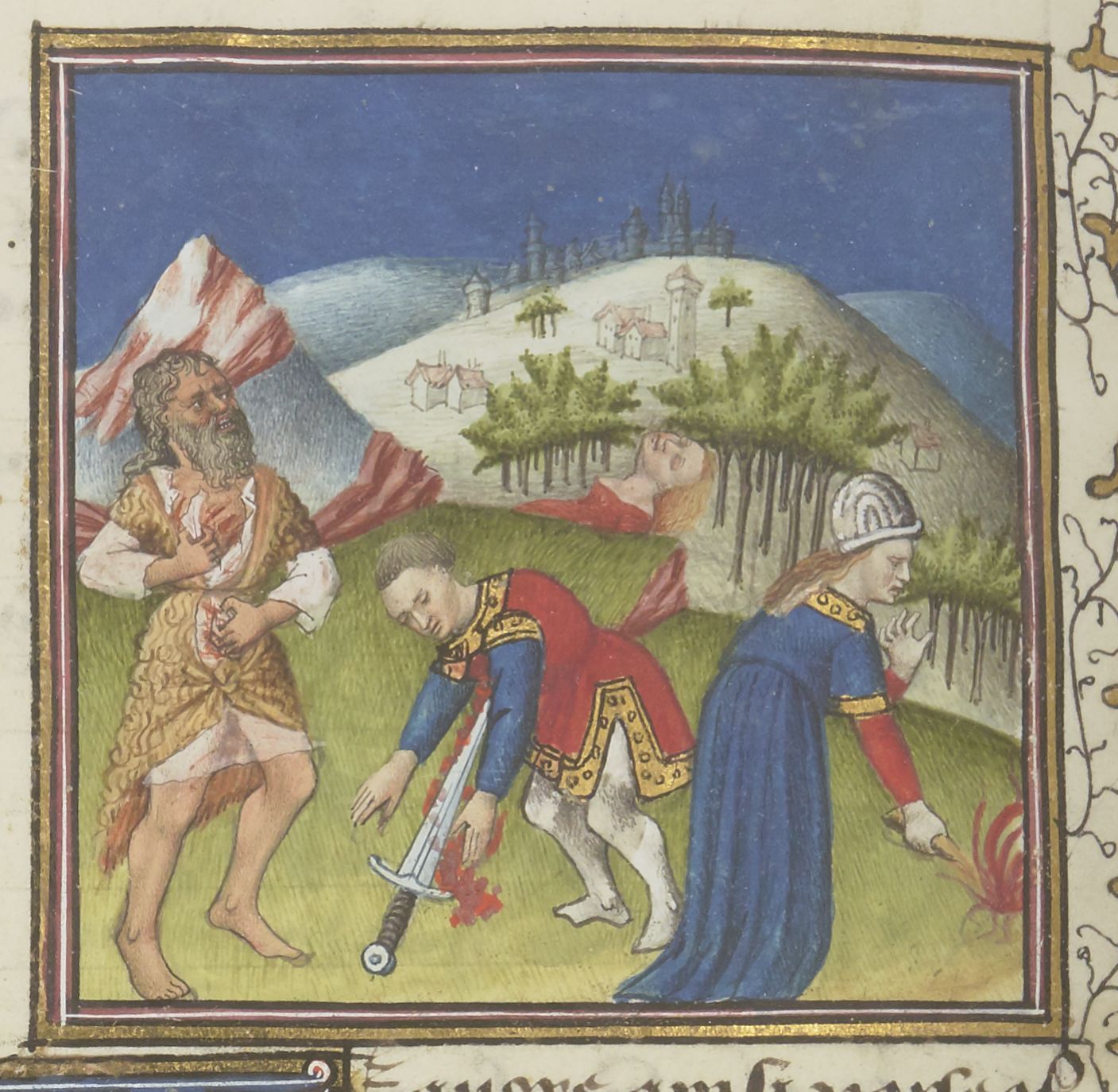 Parigi, Bibliothèque Nationale de France, Fr. 229, f. 22v. Il copista del manoscritto è Boniface de Remenant. Ercole viene bruciato dalla veste intrisa del sangue del centauro Nesso; Meleagro compie il suicidio trafiggendosi con una spada; la regina Altea mette un tizzone nel fuoco per punire suo figlio Meleagro; sullo sfondo giace il cadavere di un personaggio femminile.