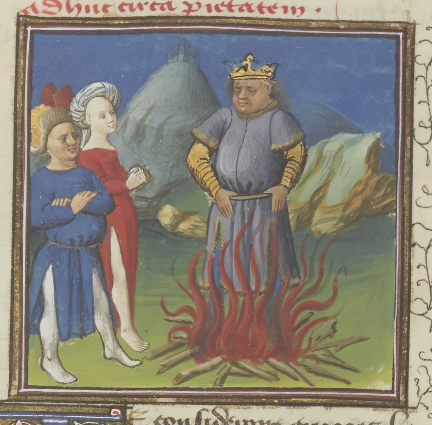 Parigi, Bibliothèque Nationale de France, Fr. 229, f. 60r. Il copista del manoscritto è Boniface de Remenant. Sardanapalo si getta nel rogo; un uomo e una donna lo osservano.
