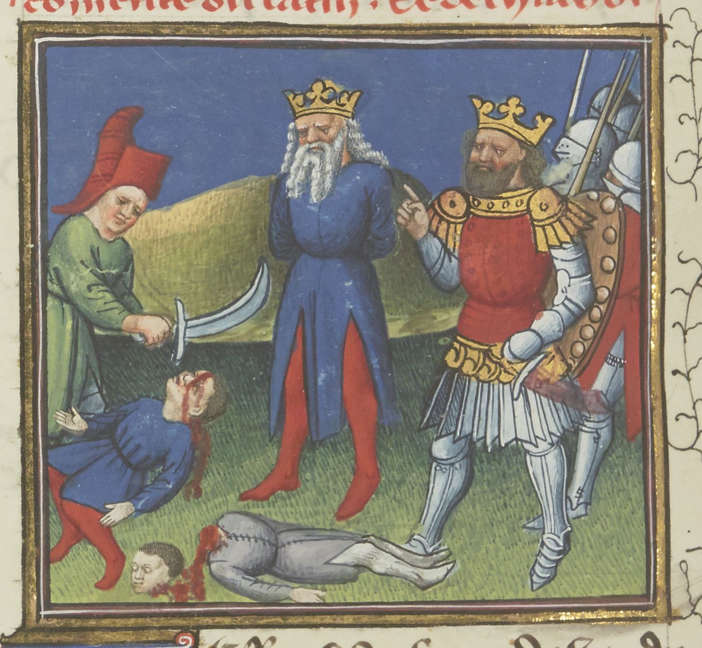 Parigi, Bibliothèque Nationale de France, Fr. 229, f. 66v. Il copista del manoscritto è Boniface de Remenant. Re Sedecia assiste al massacro dei propri figli ordinato da Salomone.