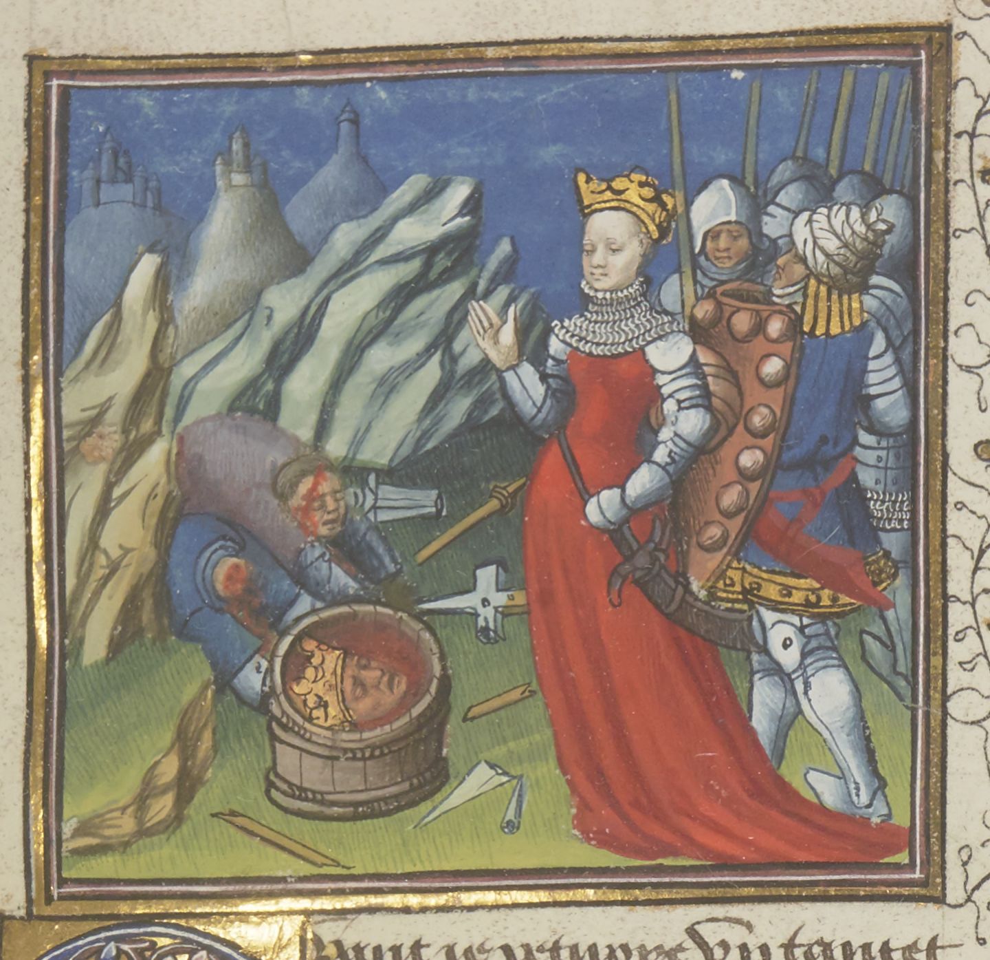 Parigi, Bibliothèque Nationale de France, Fr. 229, f. 78r. Il copista del manoscritto è Boniface de Remenant. La regina Tamiri ordina di porre la testa di Ciro in una botte piena del sangue dei suoi cavalieri.