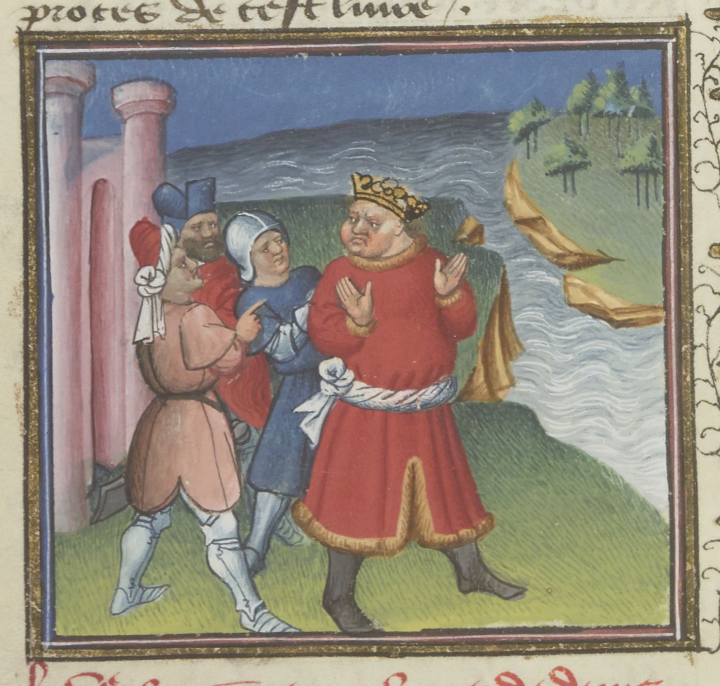 Parigi, Bibliothèque Nationale de France, Fr. 229, f. 137v. Il copista del manoscritto è Boniface de Remenant. Dionigi di Siracusa viene costretto all'esilio e cacciato dalla Sicilia.