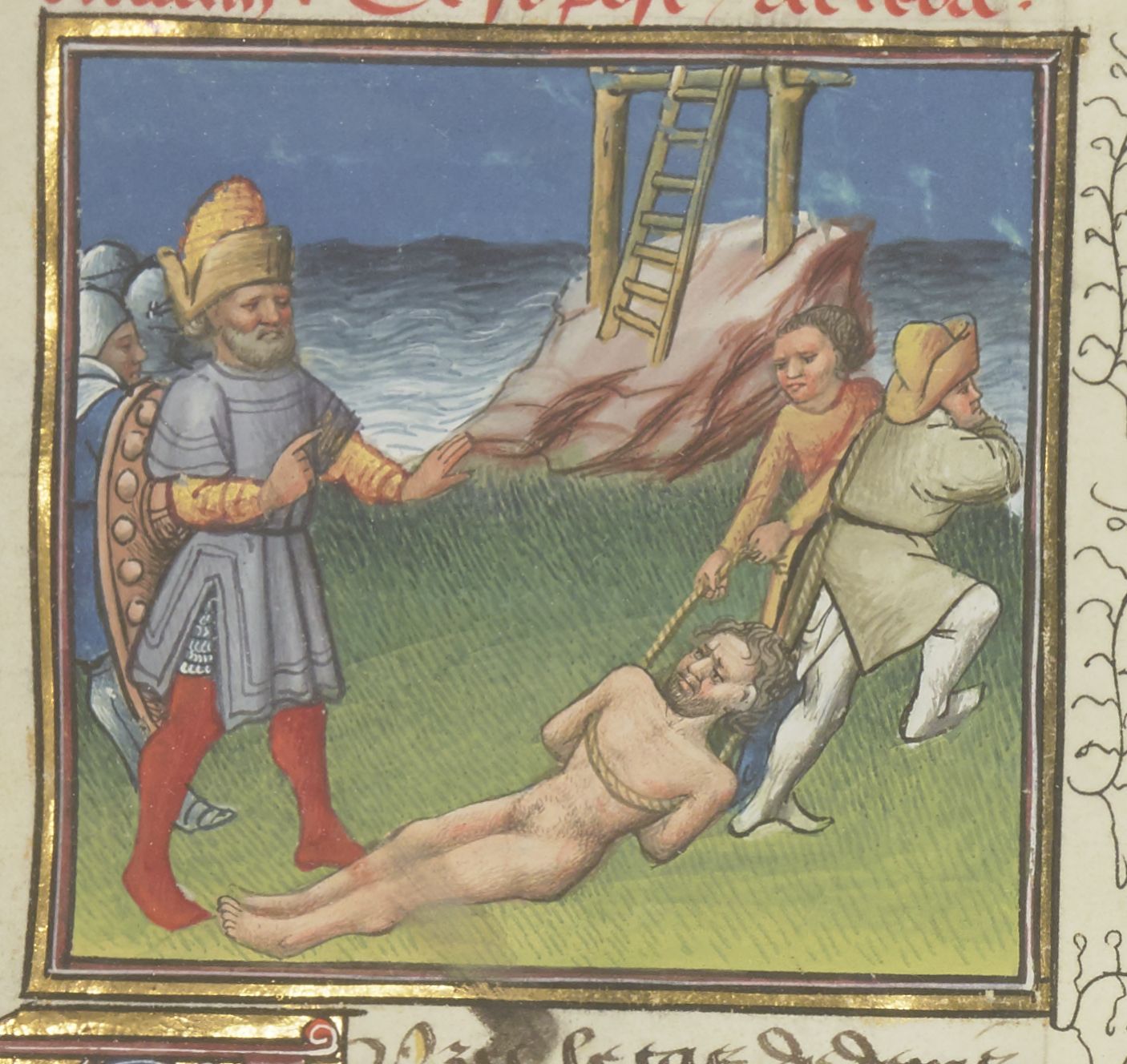 Parigi, Bibliothèque Nationale de France, Fr. 229, f. 140r. Il copista del manoscritto è Boniface de Remenant. Oronte fa impiccare Policrate, tiranno di Samo.