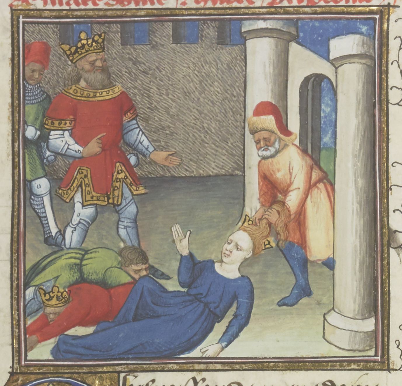 Parigi, Bibliothèque Nationale de France, Fr. 229, f. 166v. Il copista del manoscritto è Boniface de Remenant. Un uomo trascina Arsinoe per i capelli fuori dalla città, lontano dai corpi dei suoi due figli assassinati.