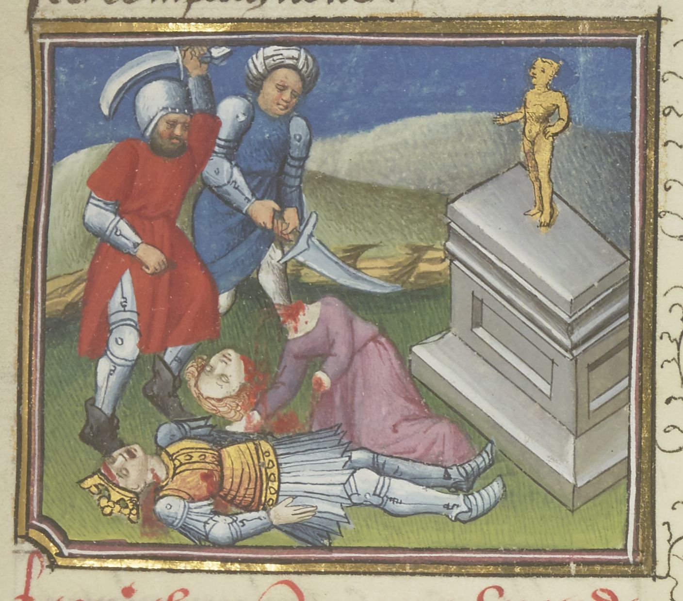 Parigi, Bibliothèque Nationale de France, Fr. 229, f. 198r. Il copista del manoscritto è Boniface de Remenant. Geronimo, tiranno di Siracusa, e Damarata, figlia di Gerone II, vengono assassinati.
