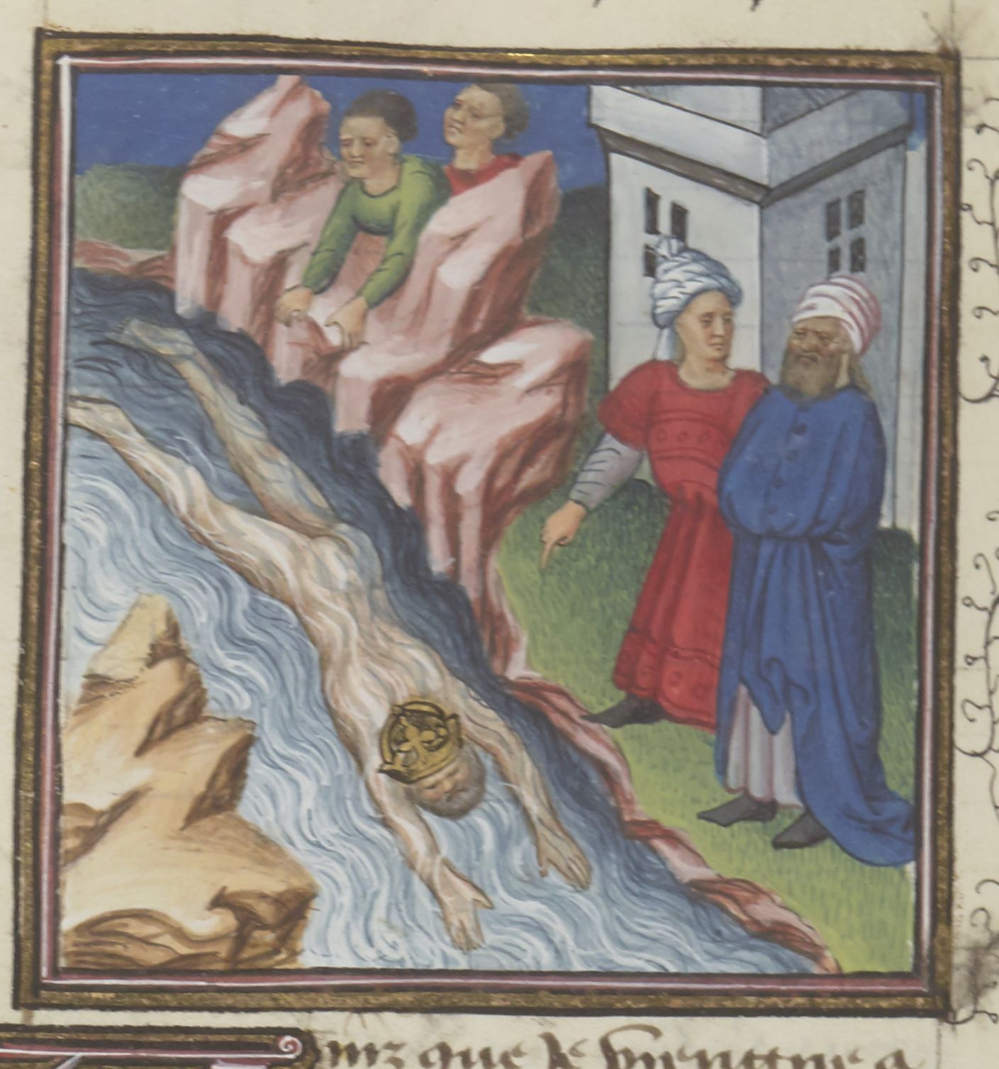 Parigi, Bibliothèque Nationale de France, Fr. 229, f. 291r. Il copista del manoscritto è Boniface de Remenant. Alcuni uomini lungo la riva indicano il cadavere dell'imperatore Vitellio, che galleggia nella corrente del Tevere.