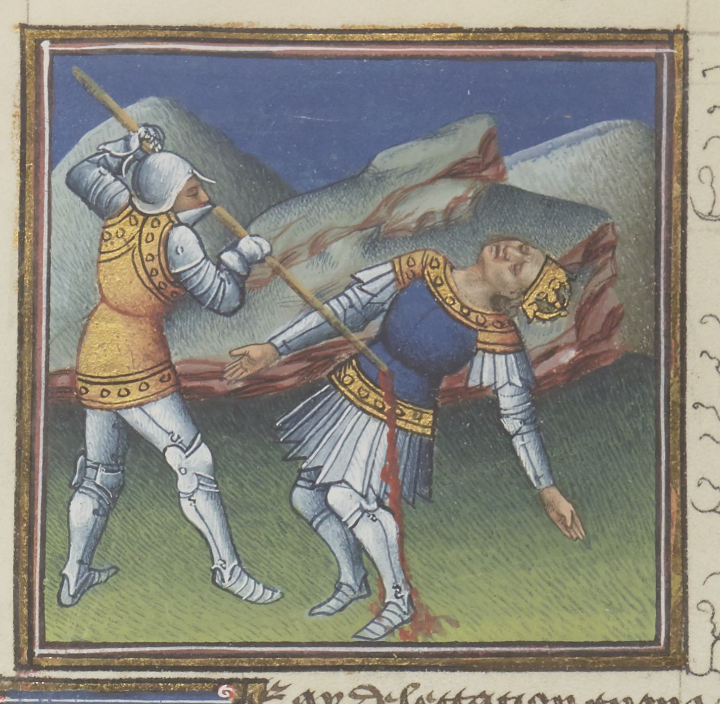 Parigi, Bibliothèque Nationale de France, Fr. 229, f. 326r. Il copista del manoscritto è Boniface de Remenant. Giuliano l'Apostata viene trafitto da Mercurio.