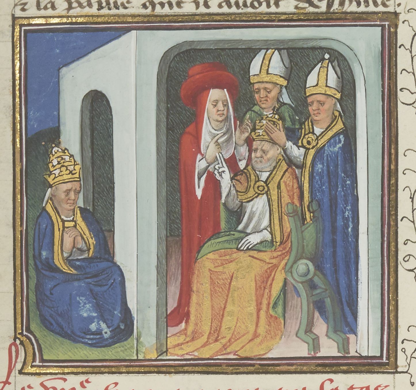 Parigi, Bibliothèque Nationale de France, Fr. 229, f. 367r. Il copista del manoscritto è Boniface de Remenant. Leone IX viene ordinato papa; Giovanni XII si pente dei propri peccati.
