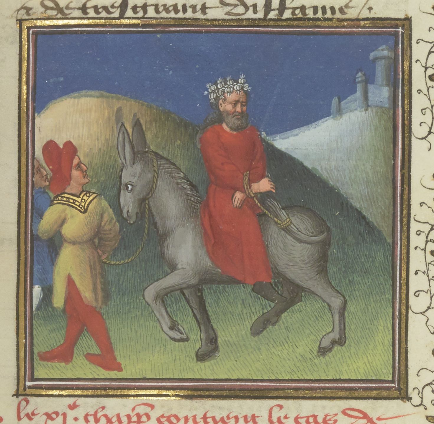 Parigi, Bibliothèque Nationale de France, Fr. 229, f. 372r. Il copista del manoscritto è Boniface de Remenant. L'imperatore Andronico viene legato al contrario sul dorso di un asino con una corona d'aglio in testa.