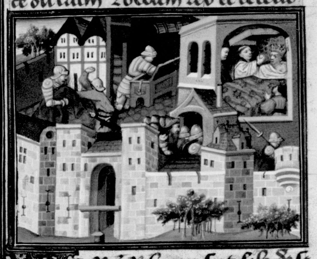 Parigi, Bibliothèque Nationale de France, Fr. 235, f. 48v. Gerusalemme viene saccheggiata dalle truppe di Sesac; Roboamo, disteso a letto in fin di vita, riceve il sacramento da un sacerdote.