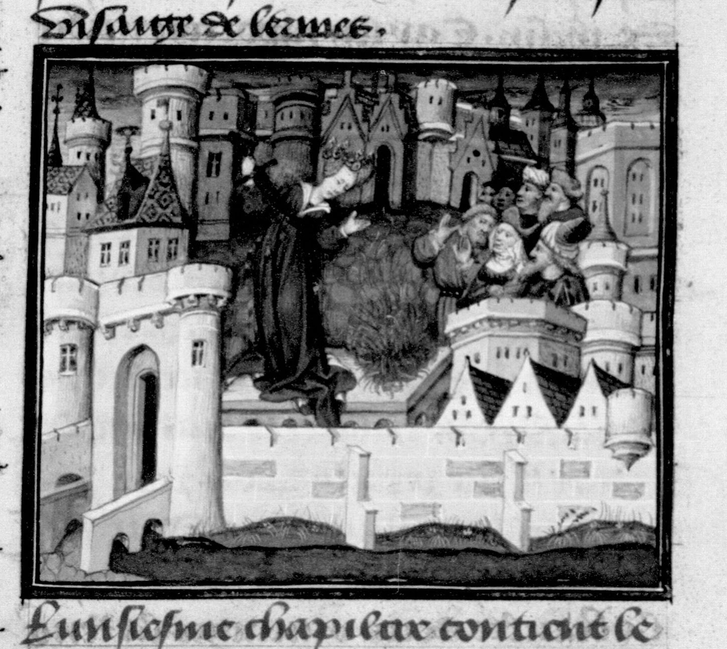 Parigi, Bibliothèque Nationale de France, Fr. 235, f. 56r. Il popolo cartaginese assiste al suicidio di Didone, che salita sulle mura della città si pugnala e si getta sulla pira funebre.