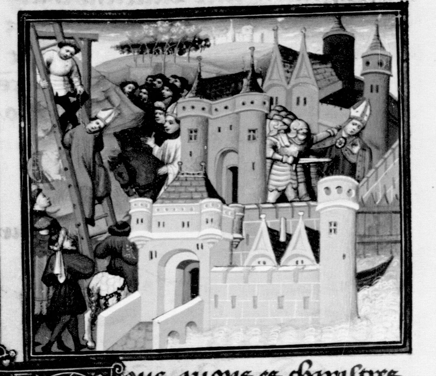 Parigi, Bibliothèque Nationale de France, Fr. 235, f. 122v. Malco fa impiccare suo figlio, il vescovo Cartalone; Malco viene assassinato (?).