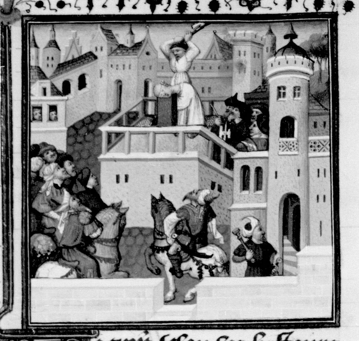 Parigi, Bibliothèque Nationale de France, Fr. 235, f. 124r. Annone, con le mani mozzate, viene giustiziato dinanzi alla folla.
