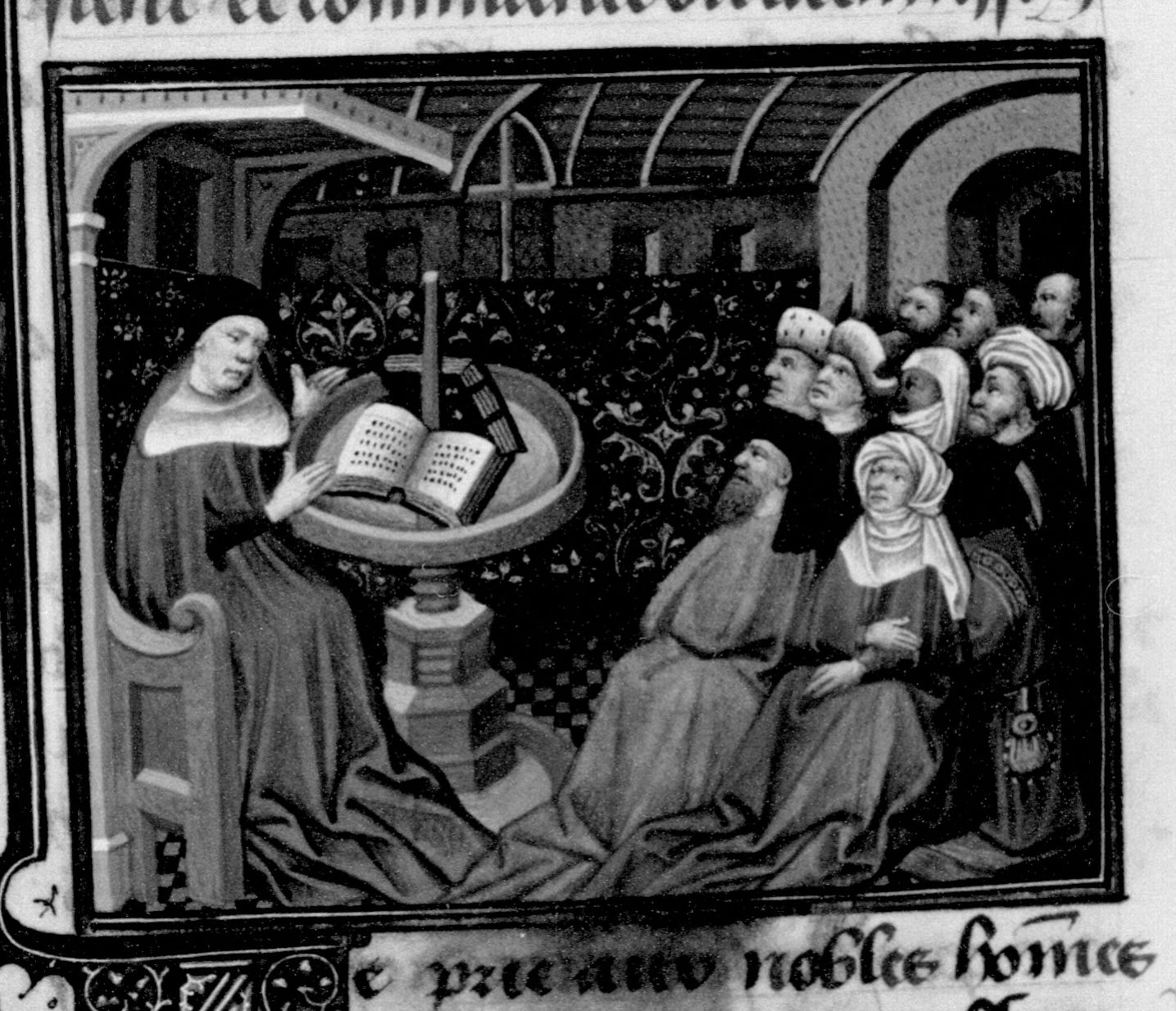 Parigi, Bibliothèque Nationale de France, Fr. 235, f. 135v. L'autore Giovanni Boccaccio, seduto dinanzi ad un leggio, rimprovera un gruppo di uomini.