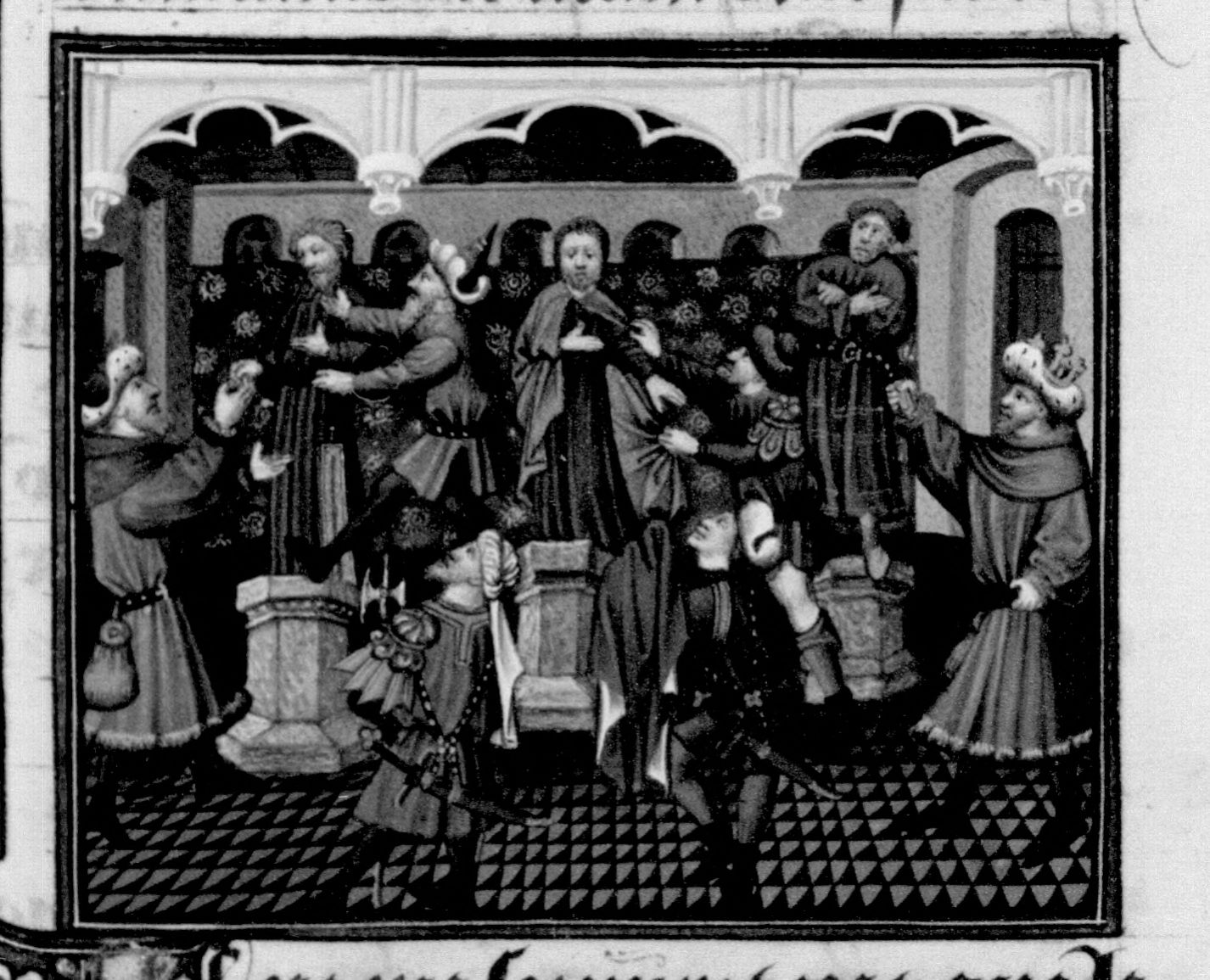 Parigi, Bibliothèque Nationale de France, Fr. 235, f. 138r. Dionigi di Siracusa ordina ai suoi uomini di spogliare le statue del tempio dei loro tesori.
