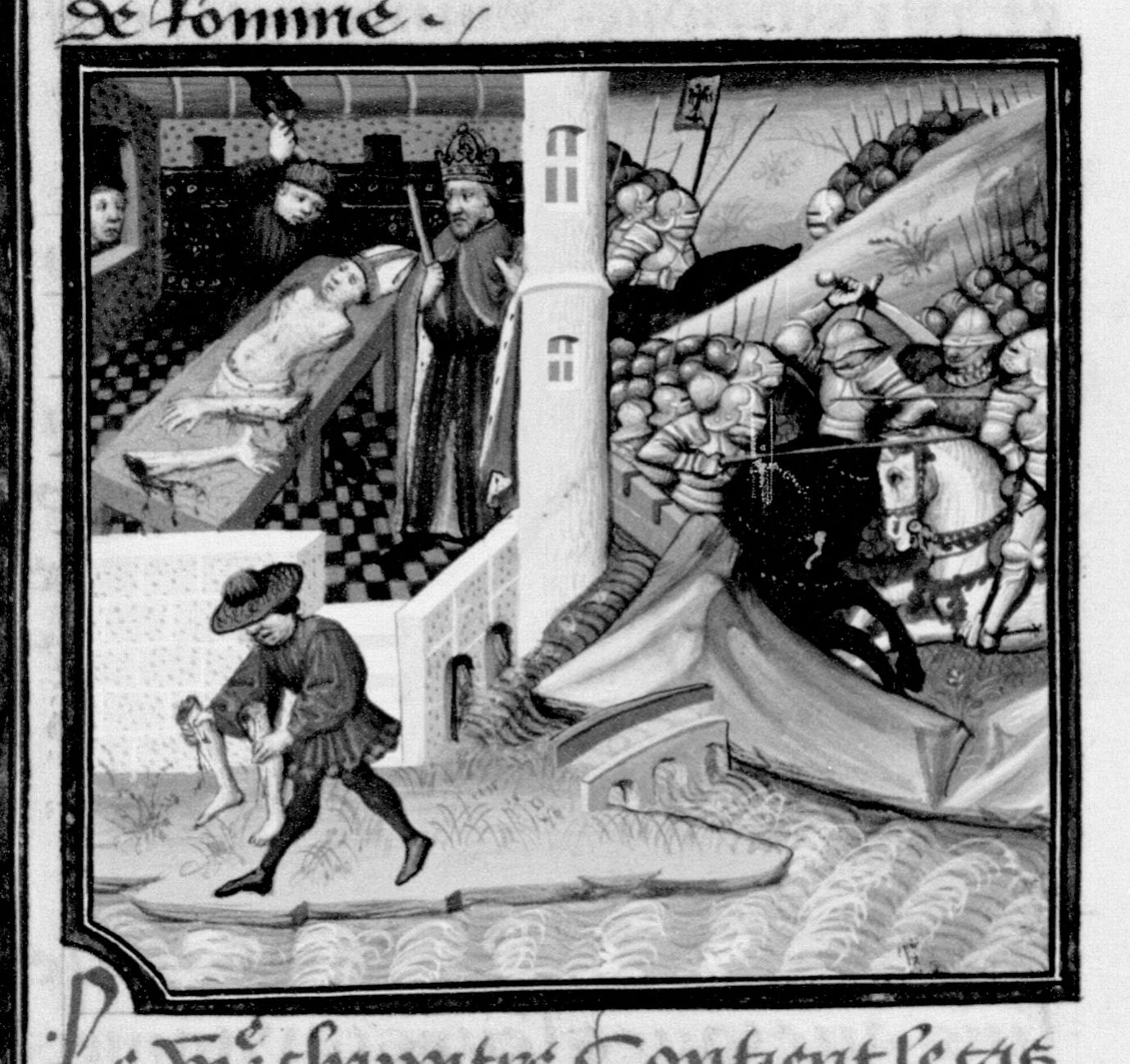Parigi, Bibliothèque Nationale de France, Fr. 236, f. 121v. Vespasiano ordina l'assassinio di Vitellio, che viene fatto a pezzi; un uomo getta nel Tevere le gambe di Vitellio.