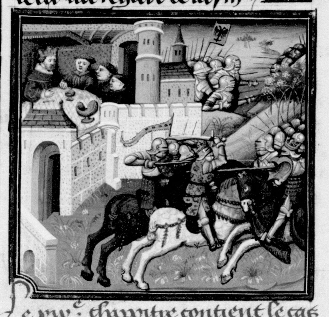 Parigi, Bibliothèque Nationale de France, Fr. 236, f. 175v. Re Artù siede alla Tavola Rotonda con i suoi cavalieri; l'esercito di Artù affronta i soldati di Mordred.