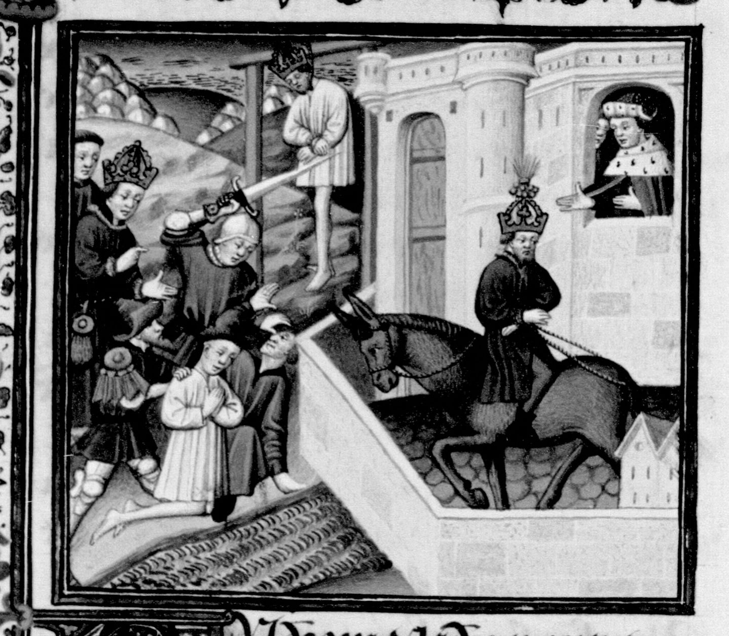 Parigi, Bibliothèque Nationale de France, Fr. 236, f. 205r. L'imperatore Andronico ordina l'assassinio di Alessio e Maria; per ordine di Isacco, Andronico viene legato sul dorso di un mulo con una cipolla posta sulla corona; in seguito Andronico viene impiccato ad una forca.