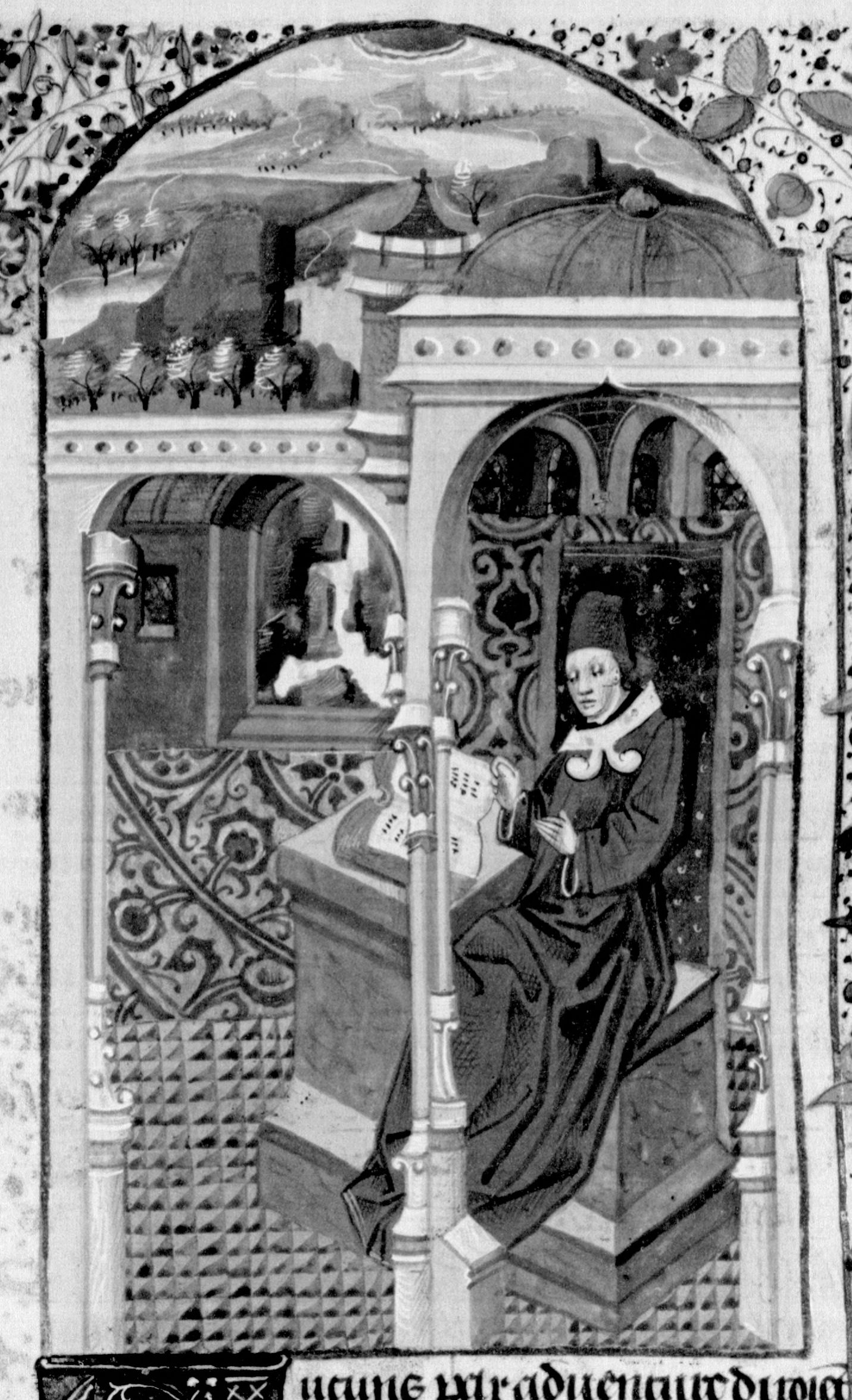 Parigi, Bibliothèque Nationale de France, Fr. 232, f. 35r. L'autore Giovanni Boccaccio seduto nel suo studio.