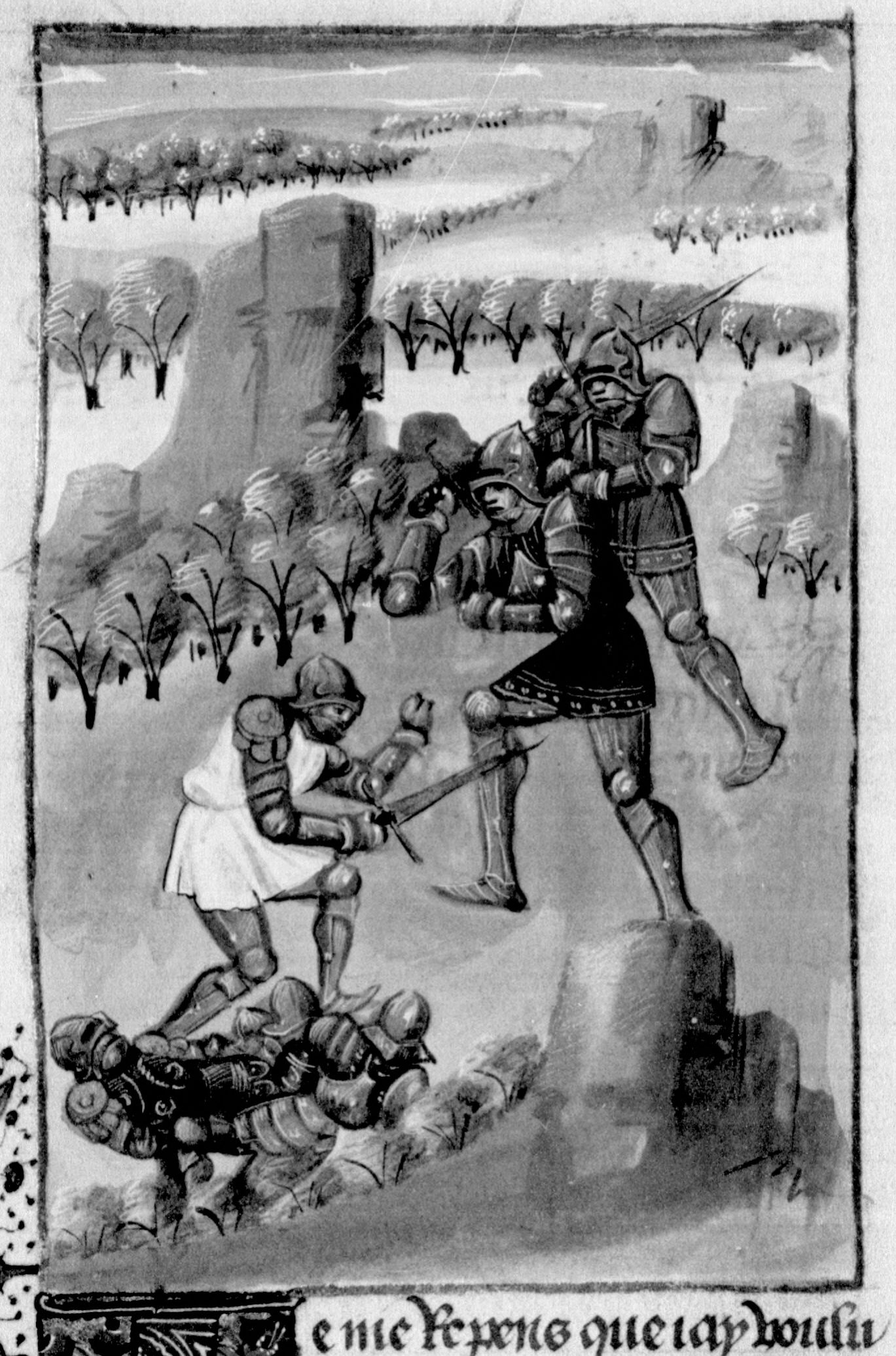 Parigi, Bibliothèque Nationale de France, Fr. 232, f. 41v. Uno scontro tra due gruppi di soldati.