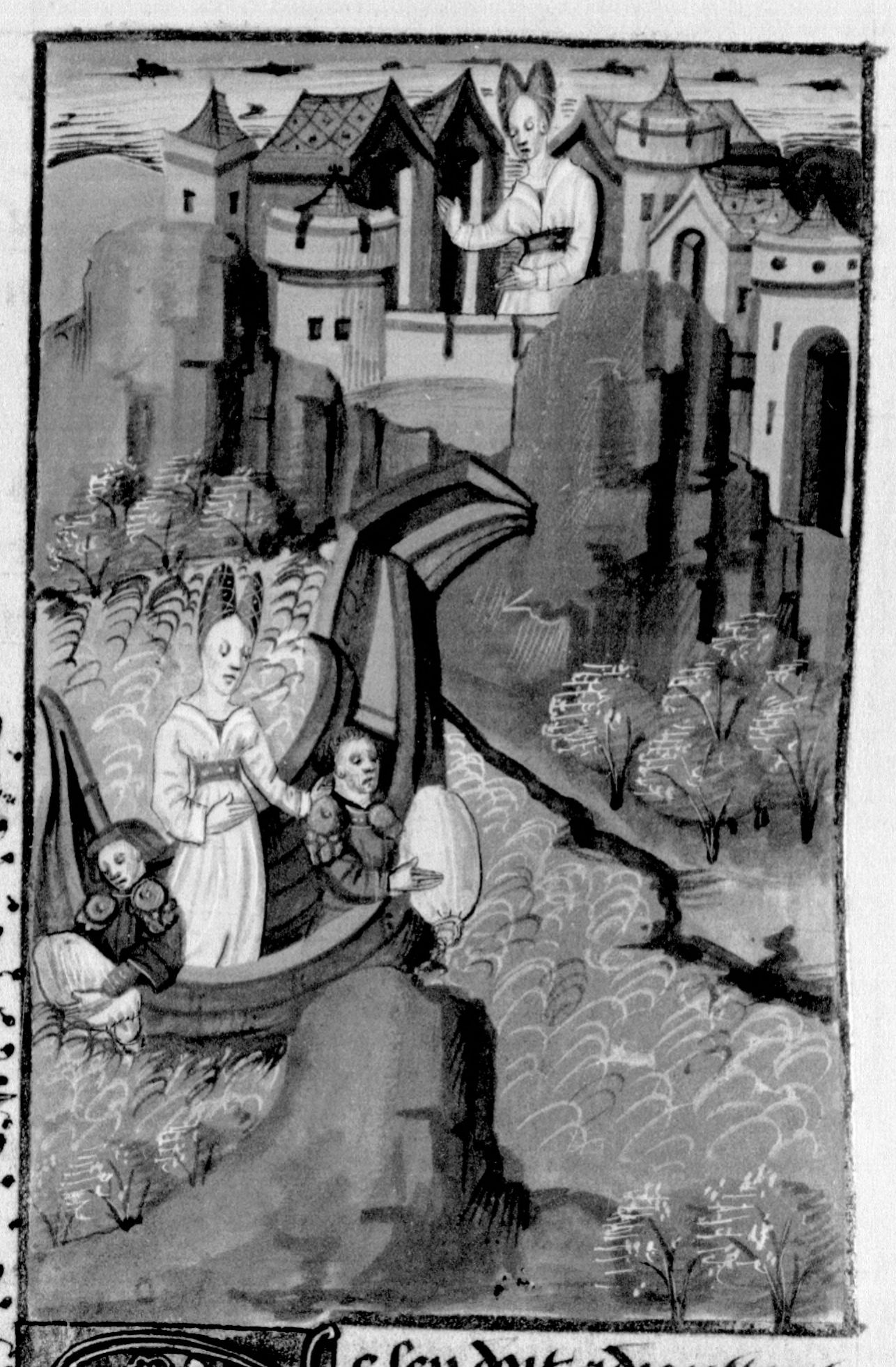 Parigi, Bibliothèque Nationale de France, Fr. 232, f. 45r. La regina Didone, allontanandosi da Tiro su una nave, fa gettare in mare i suoi tesori.
